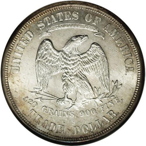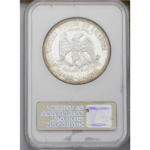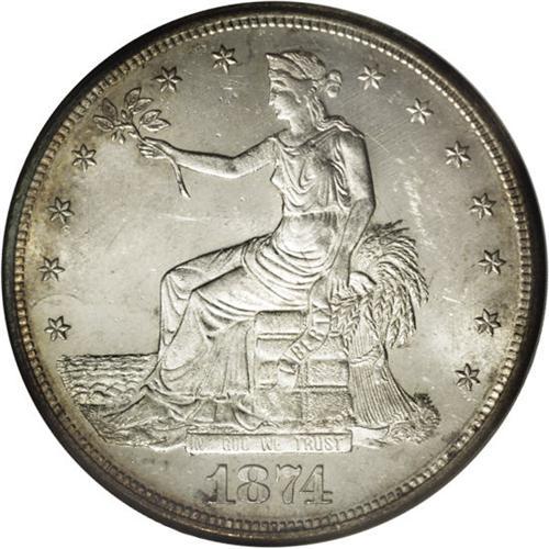 <B>1874-S<T$1> MS64 NGC.</B></I> A remarkable example, not only for its excellent technical grade, but for its aesthetic appeal as well. It is seldom that a trade dollar is found with prooflike surfaces and cameo contrast, but this is just such a coin. Both sides are fully lustrous and mostly brilliant, and they are accentuated by light gold toning near the borders. Nearly all design features are boldly struck, with slight weakness noted only at Liberty's head and the eagle's left claw (to the viewer's right). The devices are frosty with satiny fields, creating a marked cameo appearance. Census: 17 in 64, 2 finer (2/06).