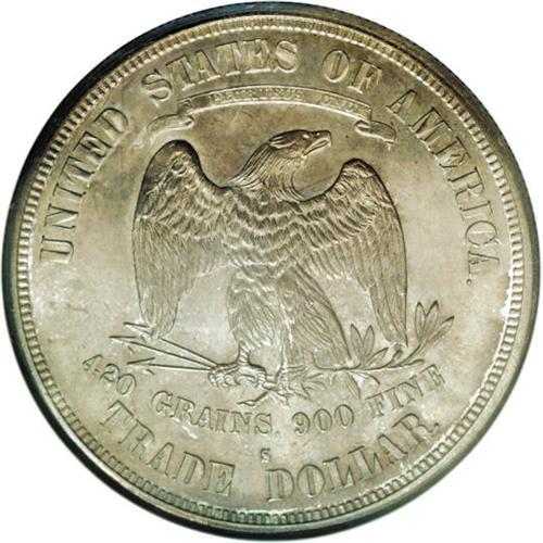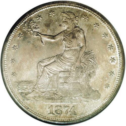 <B>1874-S T$1 MS64 NGC.</B></I> The 1874-S has a mintage of more than 2.5 million pieces, but these were produced for Oriental circulation, and none are known above the MS65 level. This lustrous, sharply struck, and exceptionally smooth near-Gem features dusky powder-blue and chestnut toning. The obverse die is interesting for its attenuated denticles below the date, which were probably weakened when the die was lapped prior to its initial use. Census: 18 in 64, 2 finer (4/07).<BR><BR><b>Shipping:</b> Coins & Currency (<a target="_blank" href="http://www.heritageauctions.com/common/shipping.php">view shipping information</a>)