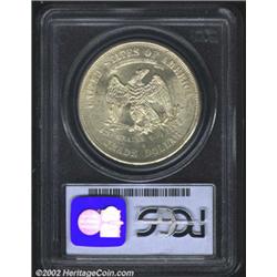 1874-S T$1 MS64 PCGS. Even though 2.5 million pieces were struck of this issue, it is surprisingly scarce, especially in Uncirculated grades. Untoned, this example is sharply defined throughout with soft, frosted mint luster. A few light field marks are scattered over each side, which account for the non-Gem grade. Population: 16 in 64, 1 finer (7/02). Important notice: We expect to be auctioning lots at the rate of 200-250 per hour. Sometimes eBay Premier live bid software cannot keep up with that pace, so we strongly recommend that you place a realistic proxy bid now as insurance to avoid disappointment. Also please note that all Heritage/CAA lots purchased through eBay Premier carry a 20% Buyer's Premium. Please make sure you read the Terms and Conditions.