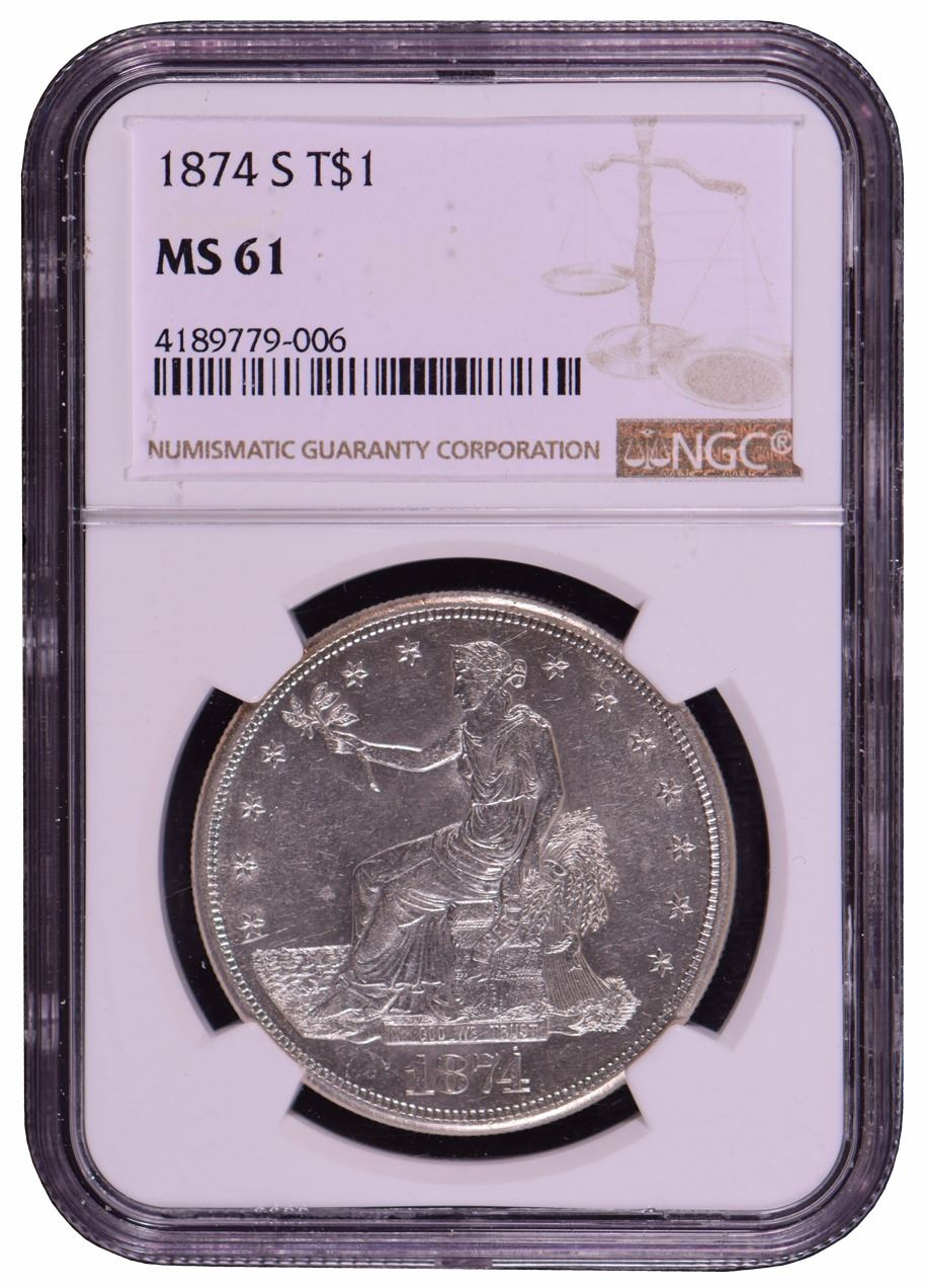One 1874-S Trade Dollar Silver Coin NGC MS61.