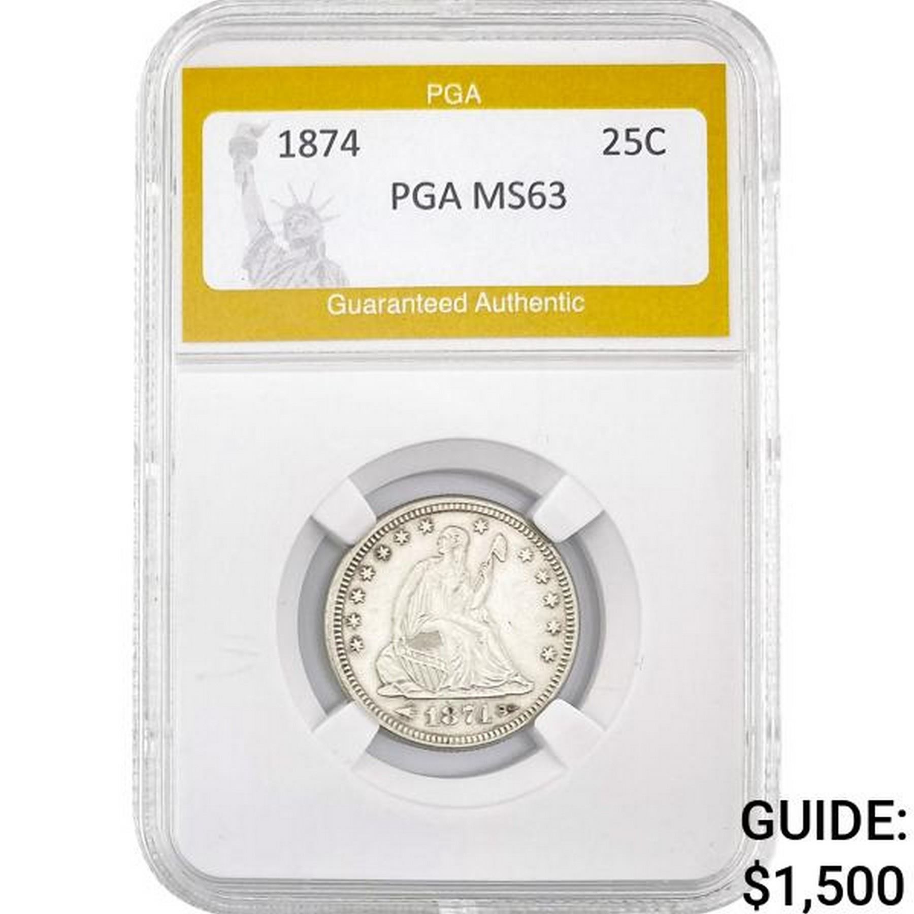 1874 Seated Liberty Quarter PGA MS63