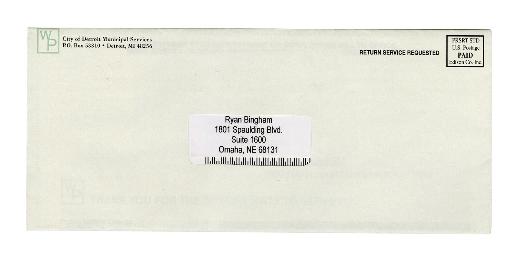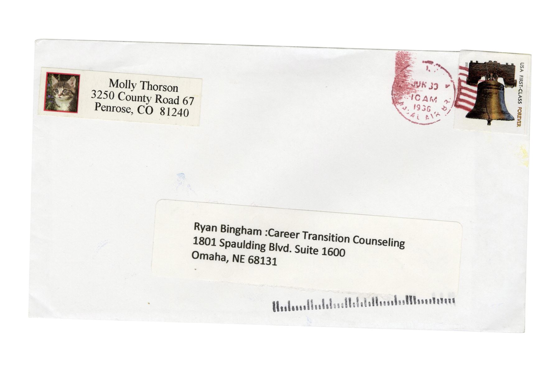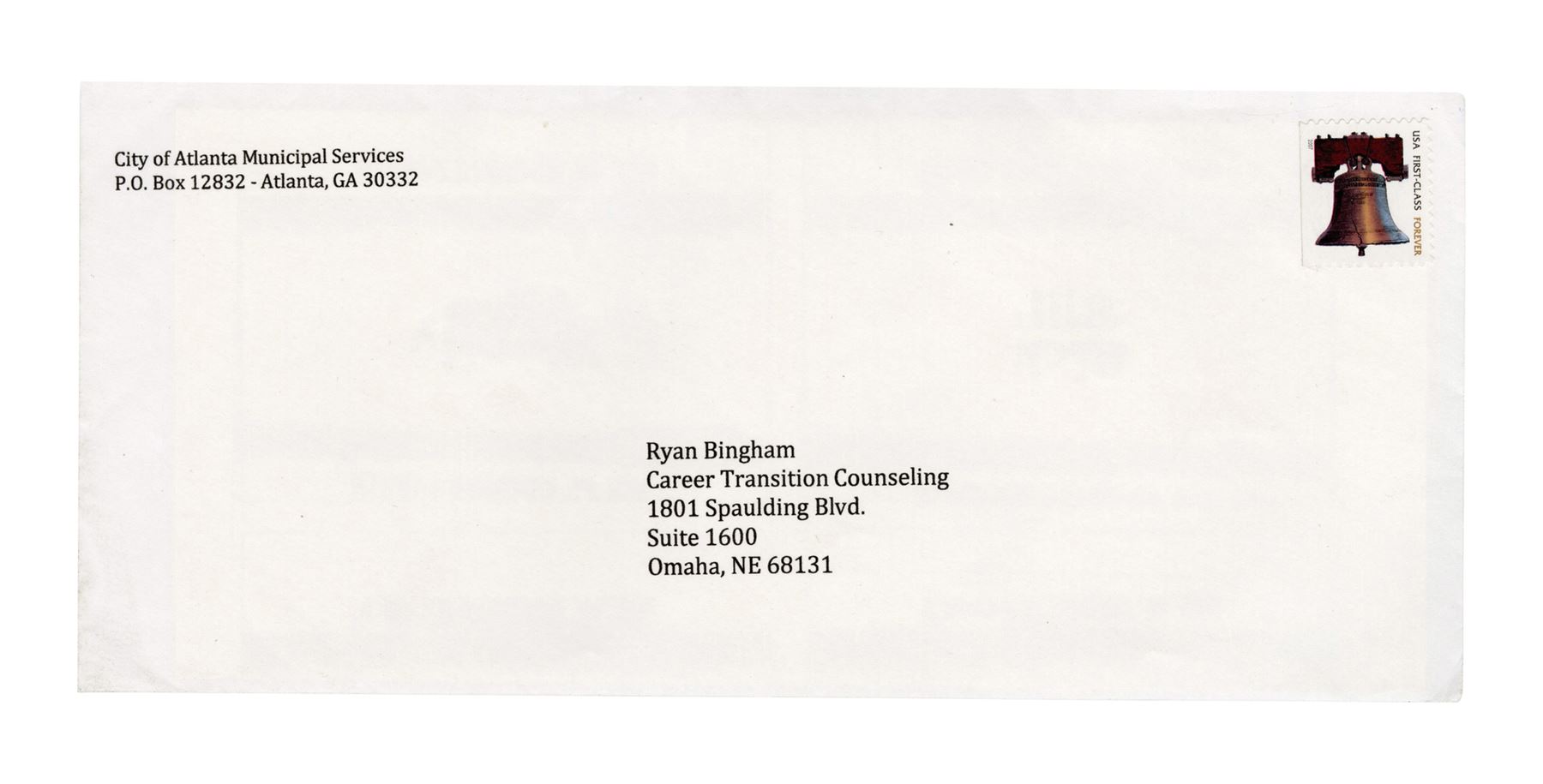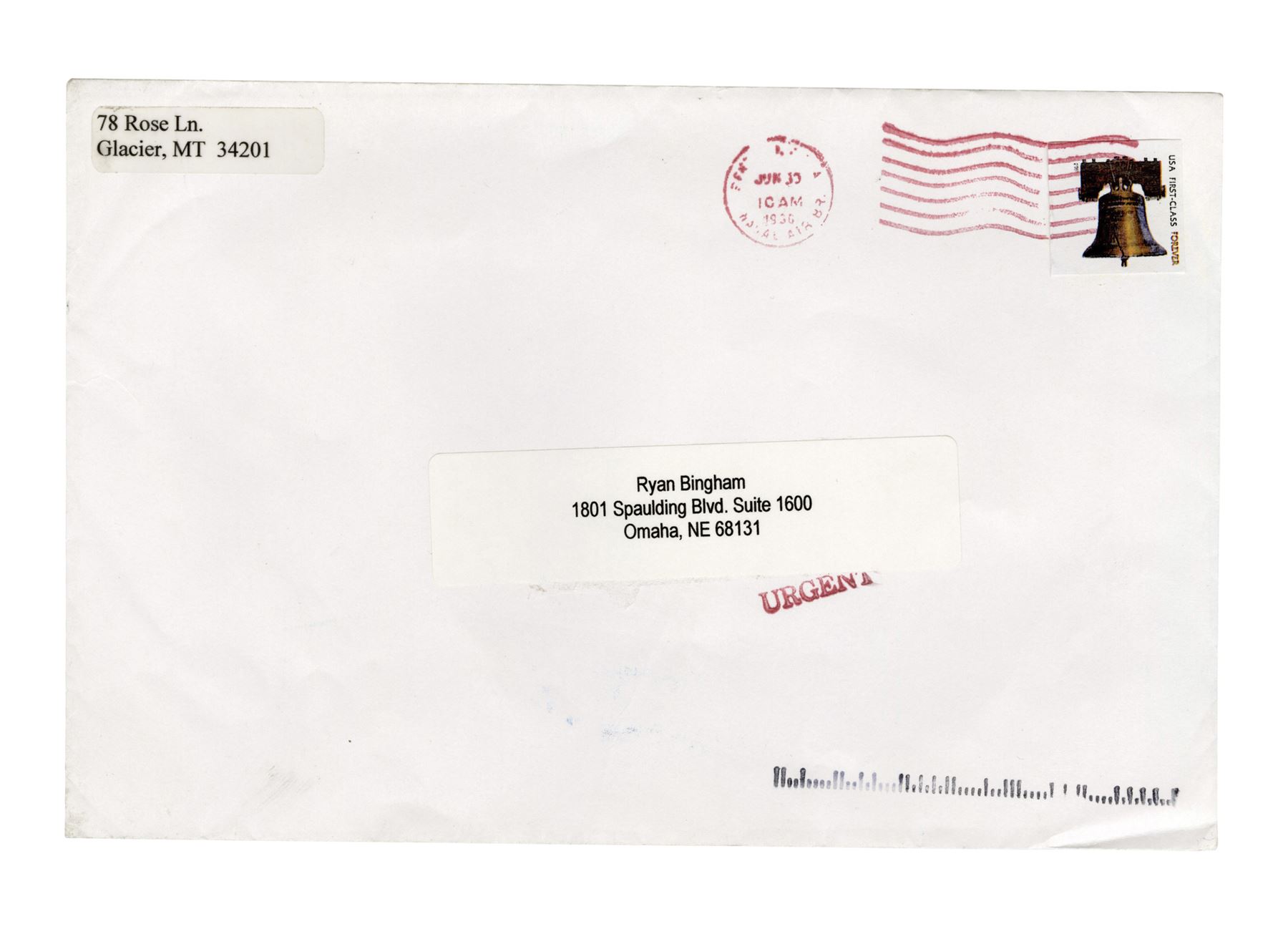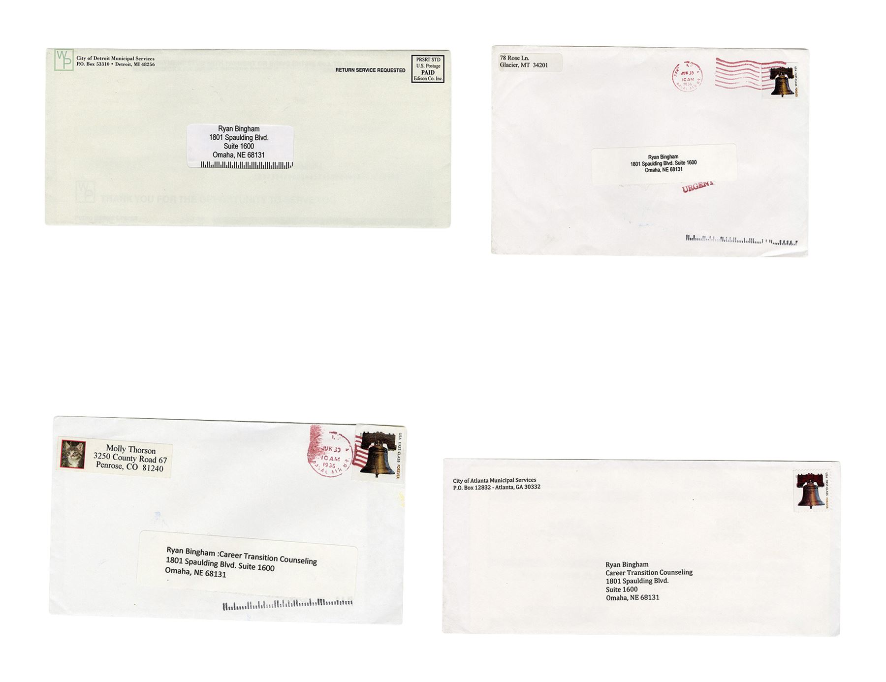 This lot consists of four sealed paper envelopes addressed to "Ryan Bingham" at the same delivery address, "1801 Spaulding Blvd." Each envelope has a different return address, with two personal labels and two business envelopes with pre-printed addresses, as well as three of the four having Liberty Bell postage. This lot exhibits creasing, lifted adhesive, and a mild discoloration on the edges. Dimensions: (largest) 9" x 6" (23 cm x 15.25 cm)