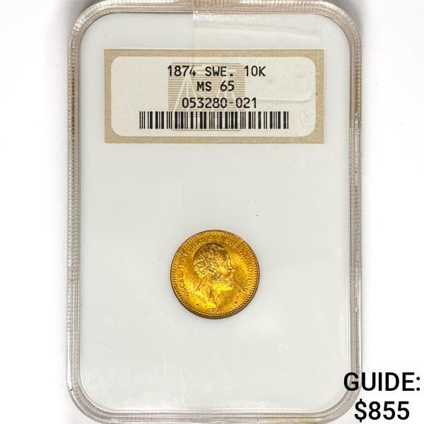 1874 Sweden 10 Kroner .1296oz. Gold NGC MS65