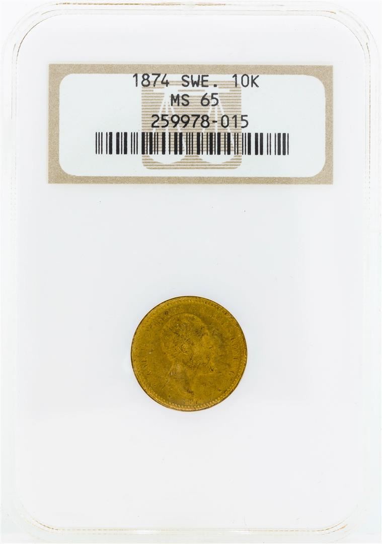 One 1874 Sweden 10 Kronor Gold Coin NGC MS65. NGC Certified.