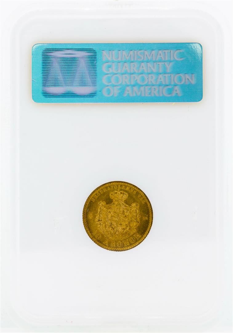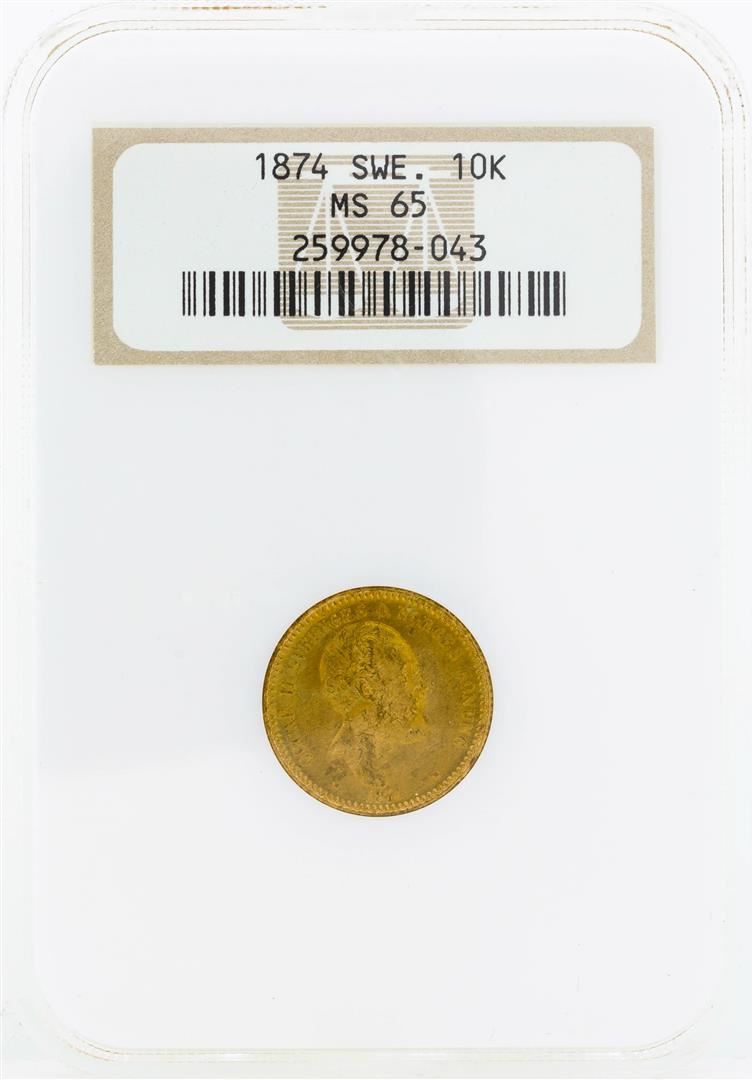 One 1874 Sweden 10 Kronor Gold Coin NGC MS65. NGC Certified.