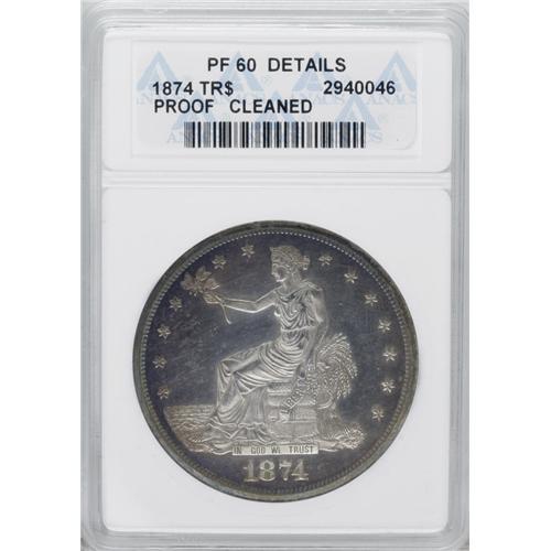 1874 T$1 --Cleaned--ANACS. PR60 Details. Plum and ice-b