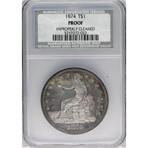 <B>1874 T$1 --Improperly Cleaned--NCS. Proof.</B></I> Blushes of golden-tan toning overlie this pearl-gray specimen. Hairlined, and the obverse field has several tiny contact marks. The strike is sharp except for the eagle's right (facing) claw. Just 700 proofs were struck.<BR><I>From The Utah Collection.</B></I><BR><BR><b>Shipping:</b> Coins & Currency (<a target="_blank" href="http://www.heritageauctions.com/common/shipping.php">view shipping information</a>)