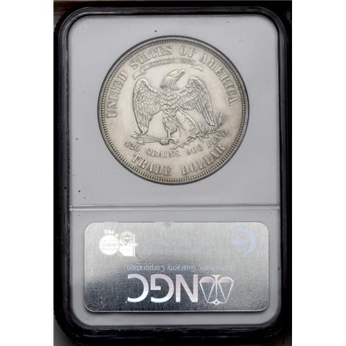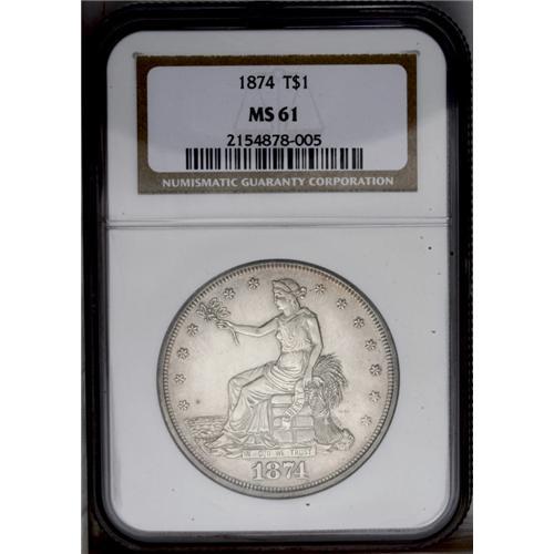 <B>1874<T$1> MS61 NGC.</B></I> This gently toned and lustrous Trade dollar has a few wispy slide marks on the obverse field, but is generally clean. The strike is soft on the eagle's right (facing) left, although most design details are sharp. Census: 15 in 61, 47 finer (3/06). <BR><BR><B>Important notice:</B> Heritage usually auctions material at the rate of 200-250 lots per hour. On some occasions eBay Live bid software or the Internet may not be able to keep up with the pace of the auction. We recommend placing a realistic absentee bid now as insurance to avoid disappointment. Occasionally the auctioneer may eliminate or reject an eBay Live bid, and the auctioneer may also reopen a lot after the close of the eBay live bidding (usually because we missed an audience bid), and may reject your bid even if it shows you as the winning bidder. By bidding via eBay Live, you agree that Heritage may award the lot to another bidder at its sole discretion under the circumstances described above or any other reasonable circumstances. Since eBay bids are not shown to us until we open the lot on the floor, we treat those bids just like floor bids. In most cases the floor responds before the eBay bid is presented to us, due to Internet lag time, so for consistency we have made it a policy that floor bids are always considered first over tie eBay live bids. Also please note that all Heritage lots purchased through eBay Live carry a 20% Buyer's Premium. Please make sure you read the Terms and Conditions before you bid. This lot is being auctioned in conjunction with a live floor auction by Heritage Galleries & Auctioneers. All final auction and invoice information will be supplied by Heritage Galleries & Auctioneers, and all other information should be considered preliminary. Lot:2216 <BR><BR><B>Winning Notification and Billing:</B> After the FINAL session in this auction is complete, Heritage will send e-mail and snail mail invoices. This process normally takes several days. All final auction and invoice information will be supplied by Heritage Galleries & Auctioneers, and all other information should be considered preliminary. <BR><BR>This auction will be conducted on a live auction floor and over the Internet through eBay Live. If you choose to place an absentee bid, please take a moment to <font color='#0000ff'><u><a href='http://pages.ebay.com/liveauctions/help/before/laabsentee.html'>learn how eBay Live absentee bidding works</a></u></font><font color='#000000'>