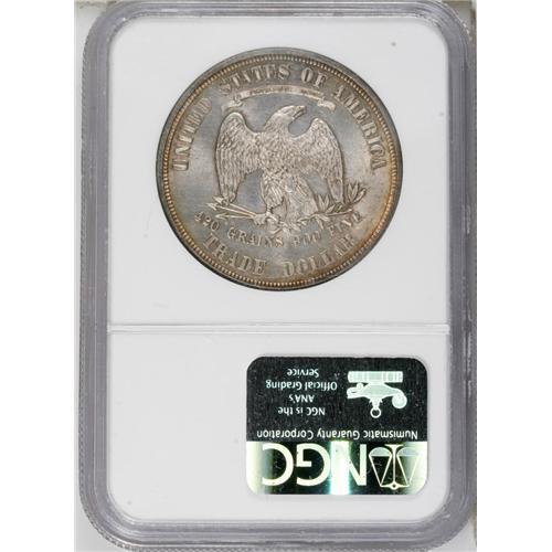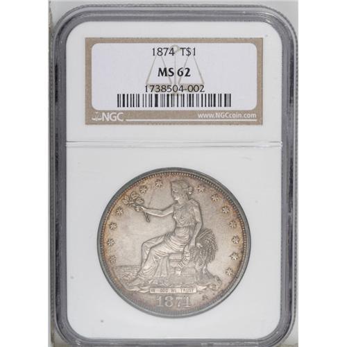 1874 T$1 MS62 NGC. Golden-brown toning at the borders