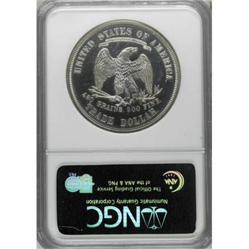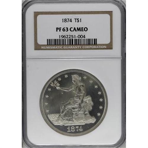 <B>1874 T$1 PR63 Cameo NGC.</B></I> This carefully preserved specimen appears brilliant upon first glance, although careful rotation reveals a hint of tan toning. The right obverse field has a few trivial hairlines, but the eye appeal is exceptional for the grade. The eagle's right (facing) leg is typically defined, but peripheral details are intricate. Just 700 proofs were struck.<BR><BR><b>Shipping:</b> Coins & Currency (<a target="_blank" href="http://www.heritageauctions.com/common/shipping.php">view shipping information</a>\)