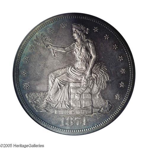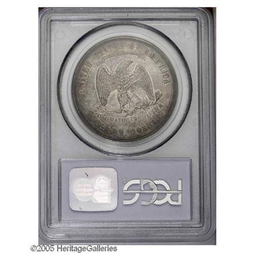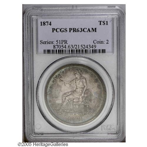 <B>1874<T$1> PR63 Cameo PCGS.</B></I> Moderate violet-gray toning has a tendency to lighten on the central motifs, with flashes of sea-green color at the margins. Scarcer second year proof issue, and appealing for the Cameo contrast and attractive toning. No surface problems aside from the expected light hairlines, commensurate for the grade. Population: 8 in 63, 11 finer (12/05).