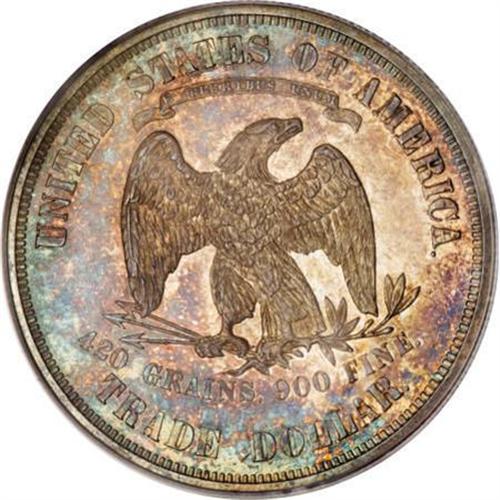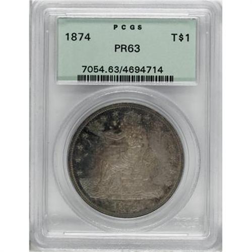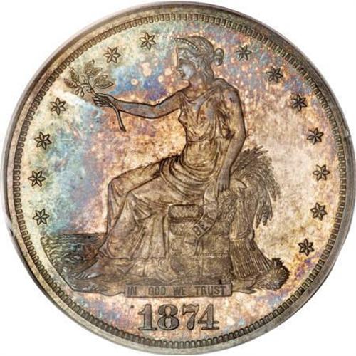<B>1874 T$1 PR63 PCGS.</B></I> Even though 700 proofs were produced of the 1874, far fewer are available today. Apparently attrition took a heavy toll on the 1873 and 1874, with many spent for face value. This was reinforced years ago by Bruce Amspacher, who commented: "The rarest of the non-clandestine [<I>i.e.,</B></I> 1884 and 1885] issues in gem condition. Most known specimens are heavily impaired." The fields of this piece are deeply mirrored, and each side displays rich rose and blue toning. The light hairlines that are present (and account for the PR63 grade) are practically invisible with the multiple layers of toning that are present. Population: 46 in 63, 49 finer (2/08).<BR><I>From The Queller Family Collection of Silver Dollars.</B></I><BR><BR><B>Coin Engraver:</B> William Barber<BR><BR><b>Shipping:</b> Coins & Currency (<a target="_blank" href="http://www.heritageauctions.com/common/shipping.php">view shipping information</a>)