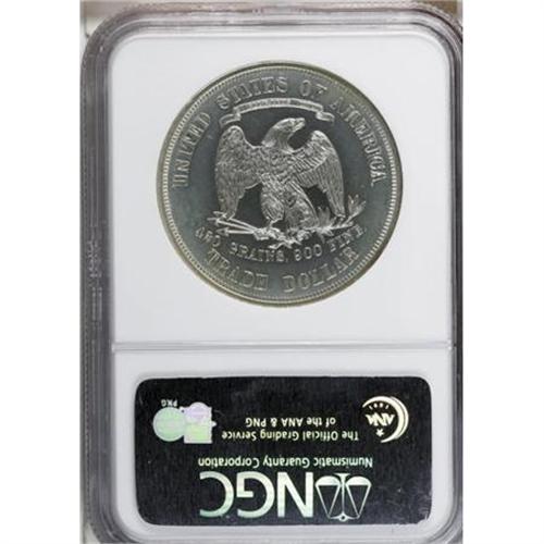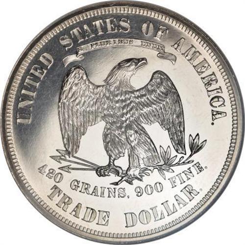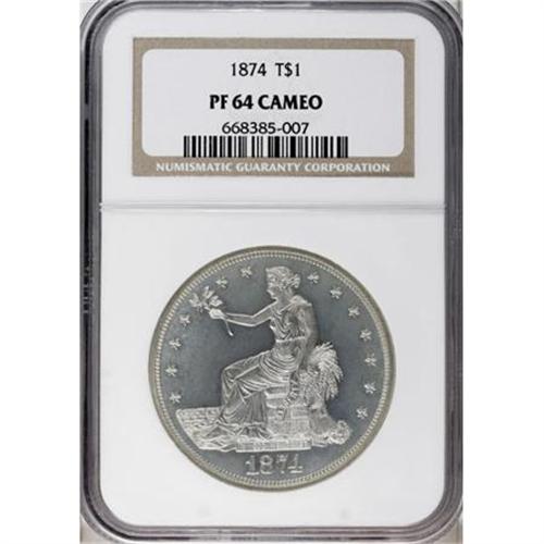 <B>1874 T$1 PR64 Cameo NGC.</B></I> With a mintage of just 700 pieces, the 1874 is tied for the second-lowest production of proof Trade dollars among publicly available issues. This gleaming specimen shows a hint of golden toning at the rims, while the centers are essentially silver-white with only a slight hint of haze. Sharply struck with distinct contrast between the mirrors and the boldly impressed, delicately frosted devices. Census: 14 in 64 Cameo, 7 finer (1/08).<BR><BR><b>Shipping:</b> Coins & Currency (<a target="_blank" href="http://www.heritageauctions.com/common/shipping.php">view shipping information</a>)