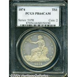<table><tbody><tr><td><table> <TR><TD width="100%"><TABLE cellSpacing=1 cellPadding=3 width="100%" border=0><TBODY><TR><TD width="100%" bgColor=#79735c><FONT face=arial color=#ffffff size=3><B>Description</B> </FONT></TD></TR><TR><TD width="100%" bgColor=#ffffff><FONT face=arial size=2><B>1874 T$1 PR64 Cameo PCGS.</B></I> This early proof striking is impressively cameoed with brilliant fields that show an abundant amount of cloudy, milky toning. Hairlines are extremely minimal and only some weakness of strike in the central regions keeps this piece from spectacular standards. Population: 2 in 64, 1 finer (10/03). </FONT></TD></TR></TBODY></TABLE></TD></TR></TBODY></TABLE><BR><A name=PricesRealized></A><TABLE cellSpacing=0 cellPadding=0 width="100%" bgColor=#000000 border=0><TBODY><TR><TD width="100%"><TABLE cellSpacing=1 cellPadding=3 width="100%" border=0><TBODY><TR><TD width="100%" bgColor=#79735c><A name=PR><FONT face=arial color=#ffffff size=3><B>Previous Prices from Heritage Auctions</B> </FONT></A></TD></TR><TR><TD bgColor=#f6f6ed><TABLE cellSpacing=0 cellPadding=0 width="100%" border=1><TBODY><TR><TD align=middle width="33%"><B>Date</B></TD><TD align=middle width="33%"><B>Service</B></TD><TD align=middle width="33%"><B>Price</B></TD></TR><TR bgColor=whitesmoke><TD width="33%"><B>08/08/2001</B></TD><TD width="33%">ANACS</TD><TD width="33%">$3,335.00</TD></TR></TBODY></TABLE></TD></TR><TR><TD bgColor=#ffffff><FONT face=arial size=1 ?>PLEASE NOTE: All prices realized reflect the final hammer price PLUS the buyer's premium in auctions that charge a buyer's premium. Each item has a notation at the top of the listing indicating whether that lot included a buyer's premium. Example: A item that sells with a final hammer price of $100 and a 20% buyer's premium will display with a price realized of $120. All information listed is intended to be as accurate as possible, but errors are possible. Please use this guide carefully and inform us of any inaccuracies. </FONT></TD></TR></TBODY></TABLE></TD></TR></TBODY></TABLE><BR><TABLE cellSpacing=0 cellPadding=0 width="100%" bgColor=#000000 border=0><TBODY><TR><TD width="100%"><TABLE cellSpacing=1 cellPadding=3 width="100%" border=0><TBODY><TR><TD width="100%" bgColor=#79735c colSpan=6><FONT face=arial color=#ffffff size=3><B>Price Guide*</B> </FONT></TD></TR><TR bgColor=#f6f6ed><TD align=middle><B>Grade</B> </TD><TD align=middle><B>Coin World<BR>(Trends)</B> </TD><TD align=middle><B>Numismedia<BR>Retail</B> </TD><TD align=middle><B>Numismedia<BR>Wholesale</B> </TD><TD align=middle><B>Coin<BR>Universe</B> </TD><TD align=middle><B>Heritage<BR>Value Index</B> </TD></TR><TR bgColor=#ffffff><TD align=middle>63</TD><TD align=right>---</TD><TD align=right>---</TD><TD align=right>---</TD><TD align=right>---</TD><TD align=right>---</TD></TR><TR style="FONT-WEIGHT: bold" bgColor=#cccfdd><TD align=middle>64</TD><TD align=right>---</TD><TD align=right>---</TD><TD align=right>---</TD><TD align=right>---</TD><TD align=right>---</TD></TR><TR bgColor=#ffffff><TD align=middle>65</TD><TD align=right>---</TD><TD align=right>---</TD><TD align=right>---</TD><TD align=right>---</TD><TD align=right>---</TD></TR><TR bgColor=#ffffff><TD colSpan=6><FONT size=1>*All information listed is intended to be as accurate as possible, but errors are possible. No item may be returned or refused based on this information which is provided as a service to our customers. You should contact each pricing source directly to determine the accuracy of this information. </FONT></TD></TR></TBODY></TABLE></TD></TR></TBODY></TABLE><BR><TABLE cellSpacing=0 cellPadding=0 width="100%" bgColor=#000000 border=0><TBODY><TR><TD width="100%"><TABLE cellSpacing=1 cellPadding=3 width="100%" border=0><TBODY><TR><TD width="100%" bgColor=#79735c><FONT face=arial color=#ffffff size=3><B>Population Guide</B> </FONT></TD></TR><TR bgColor=#ffffff><TD align=middle><!-- Begin Output of Population Grid--><TABLE cellSpacing=0 cellPadding=0 width="100%" border=0><TBODY><TR><TD vAlign=center><TABLE cellSpacing=0 width="100%" border=1 cellsadding="3"><TBODY><TR><TD vAlign=center><TABLE cellSpacing=0 cellPadding=3 width="100%" border=1><TBODY><TR><TD vAlign=center align=middle bgColor=#f0f1e8 colSpan=2 <CENTER><FONT face=Arial size=2><B>PCGS Pop </B></FONT><CENTER></CENTER></TD><TD vAlign=center align=middle bgColor=#f0f1e8 colSpan=2><CENTER><FONT face=Arial size=2><B>NGC Pop</B></CENTER></FONT></TD></TR><TR><TD vAlign=center><FONT face=Arial size=2>(64)</FONT> </TD><TD vAlign=center align=right><FONT face=Arial size=2>2</FONT> </TD><TD vAlign=center><FONT face=Arial size=2>(64)</FONT> </TD><TD vAlign=center align=right><FONT face=Arial size=2>12</FONT> </TD></TR><TR><TD vAlign=center><FONT face=Arial size=2>(>64)</FONT> </TD><TD vAlign=center align=right><FONT face=Arial size=2>1</FONT> </TD><TD vAlign=center><FONT face=Arial size=2>(>64)</FONT> </TD><TD vAlign=center align=right><FONT face=Arial size=2>4</FONT> </TD></TR></TBODY></TABLE></TD></TR></TBODY></TABLE></TD></TR></TBODY></TABLE><!-- End Output of Population Grid--></TD></TR></TBODY></TABLE></TD></TR></TBODY></TABLE><BR><TABLE cellSpacing=0 cellPadding=0 width="100%" bgColor=#000000 border=0><TBODY><TR> <font color='#000000'><span style='background-color: #FFFFFF'><td bgcolor='#FFFFFE'> Important notice: Heritage usually auctions material at the rate of 200-250 lots per hour. On some occasions eBay Live bid software or the Internet may not be able to keep up with the pace of the auction. We recommend placing a realistic absentee bid now as insurance to avoid disappointment. Occasionally the auctioneer may eliminate or reject an eBay Live bid, and the auctioneer may also reopen a lot after the close of the eBay live bidding (usually because we missed an audience bid), and may reject your bid even if it shows you as the winning bidder. By bidding via eBay Live, you agree that Heritage may award the lot to another bidder at its sole discretion under the circum