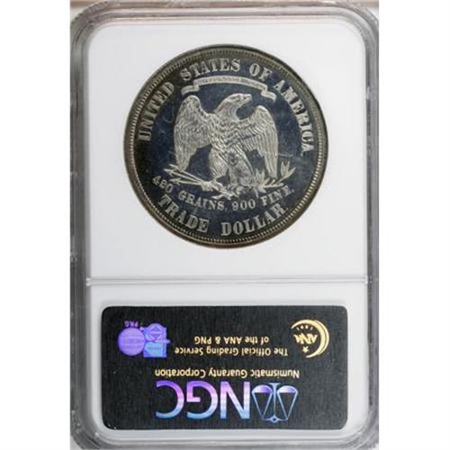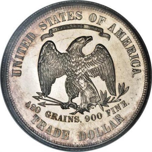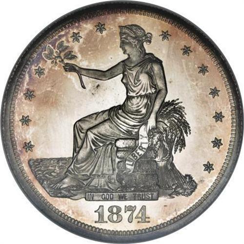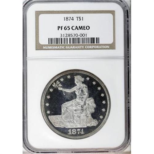 <B>1874 T$1 PR65 Cameo NGC.</B></I> Occasional blushes of purple and blue patina visit the margins of this Trade dollar, yielding to lightly toned or untoned central areas. An attentive strike delineates the design elements, save for softness on the eagle's right facing leg and tail. Both sides exhibit excellent field-motif contrast, and reveal just a few minor handling marks. Census: 6 in 65 Cameo, 1 finer (1/08).<BR><BR><b>Shipping:</b> Coins & Currency (<a target="_blank" href="http://www.heritageauctions.com/common/shipping.php">view shipping information</a>)