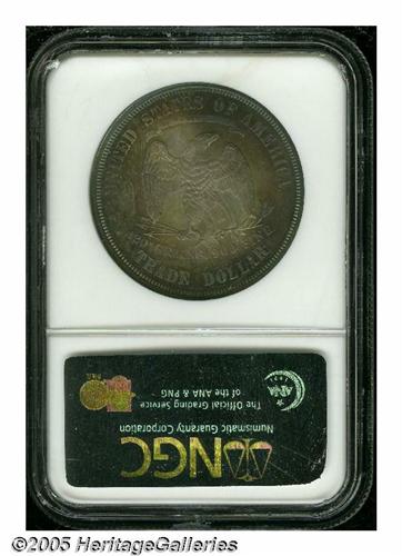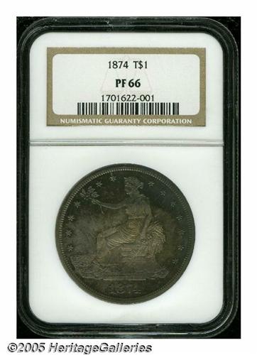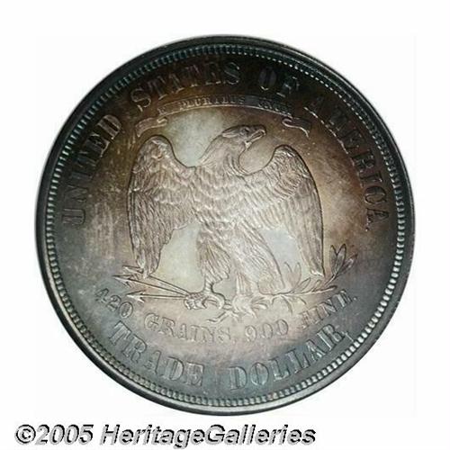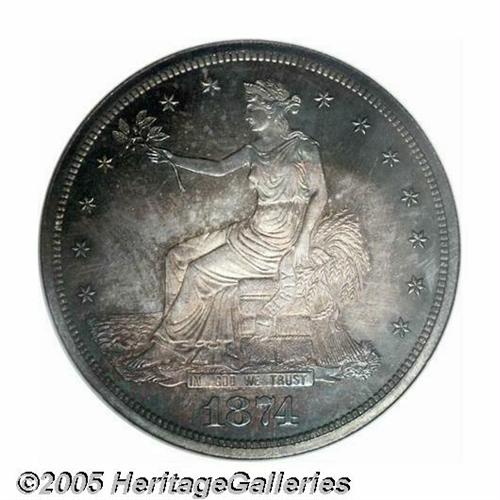 <B>1874<T$1> PR66 NGC.</B></I> Luxuriously toned in electric-blue, gold, and rose-red colors. Liberty's head and nearby stars are intricately struck, not always the case for this scarce type, although the eagle's right (facing) claw has not received a complete blow from the dies. Tough to locate in any grade due to a low production of 700 pieces, but examples with the beautiful patination and exquisite preservation of the present specimen are nearly unobtainable. Population: 6 in 66, 2 finer (5/05).