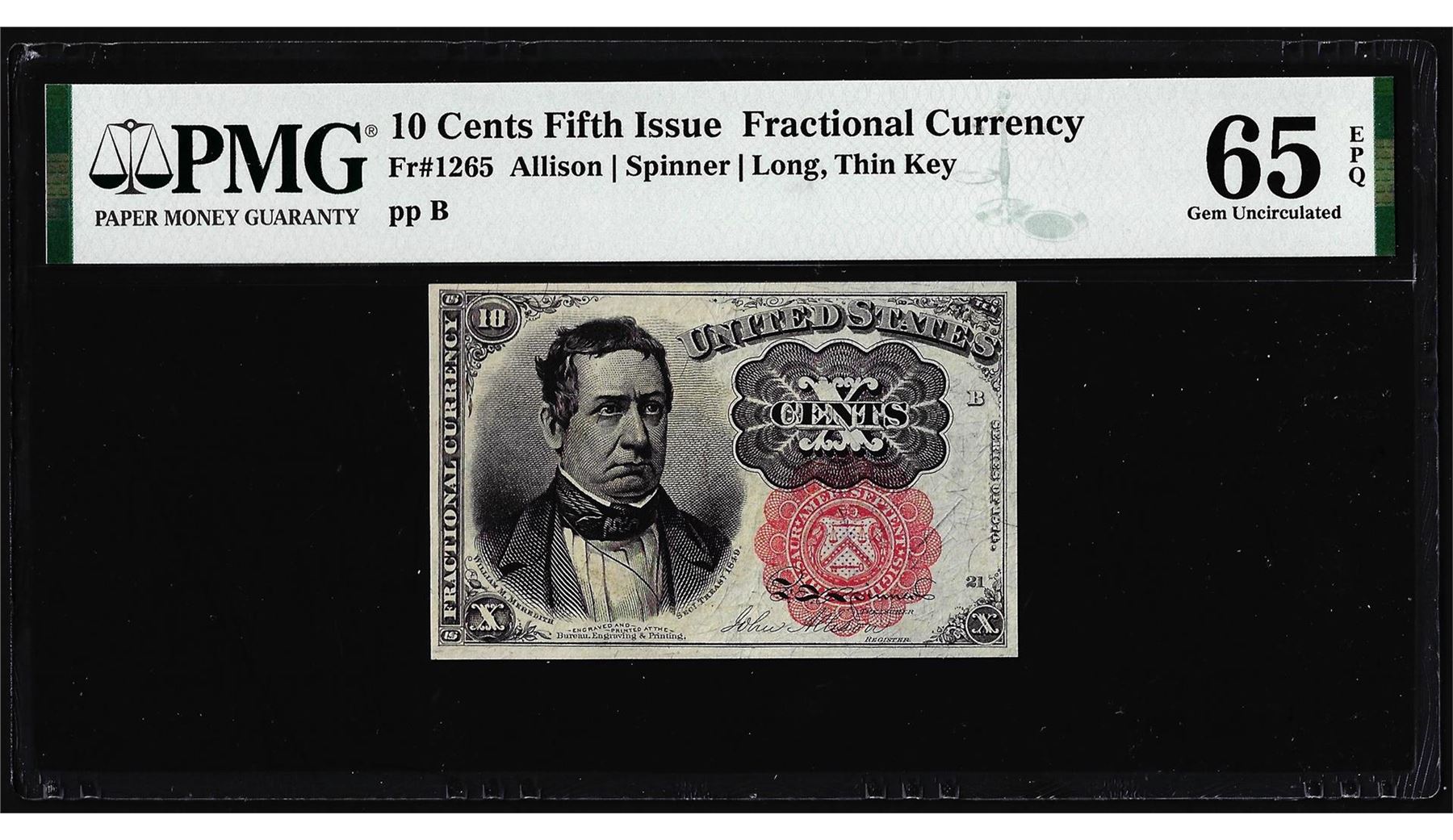 One 1874 Ten Cent Fifth Issue Fractional Note Fr.1265 PMG Gem Uncirculated 65EPQ. PMG Certified.