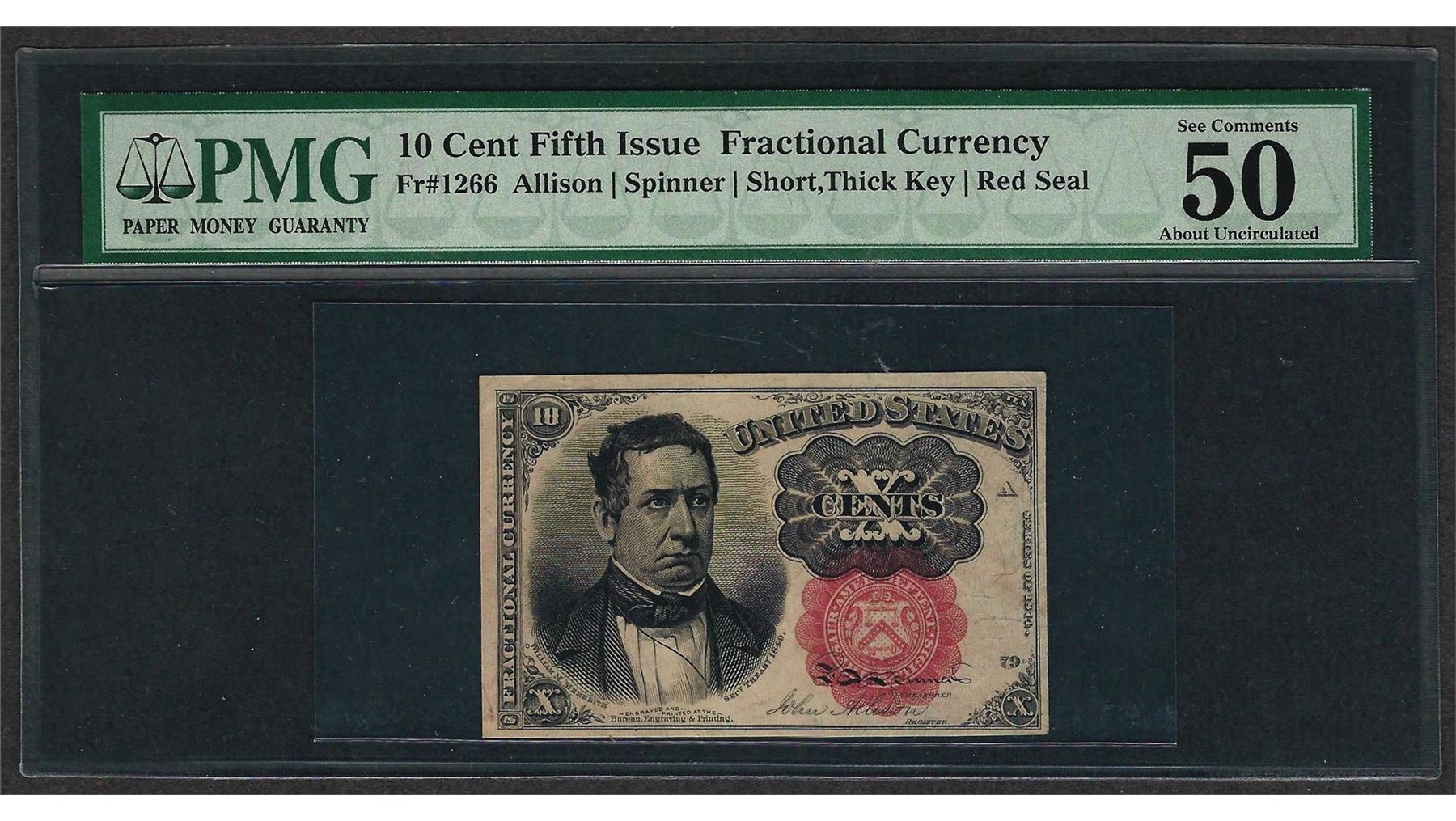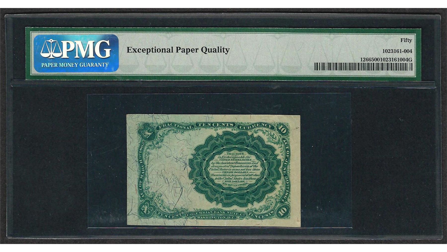 One 1874 Ten Cents Fifth Issue Fractional Currency Note PMG About Uncirculated 50EPQ. PMG Certified.