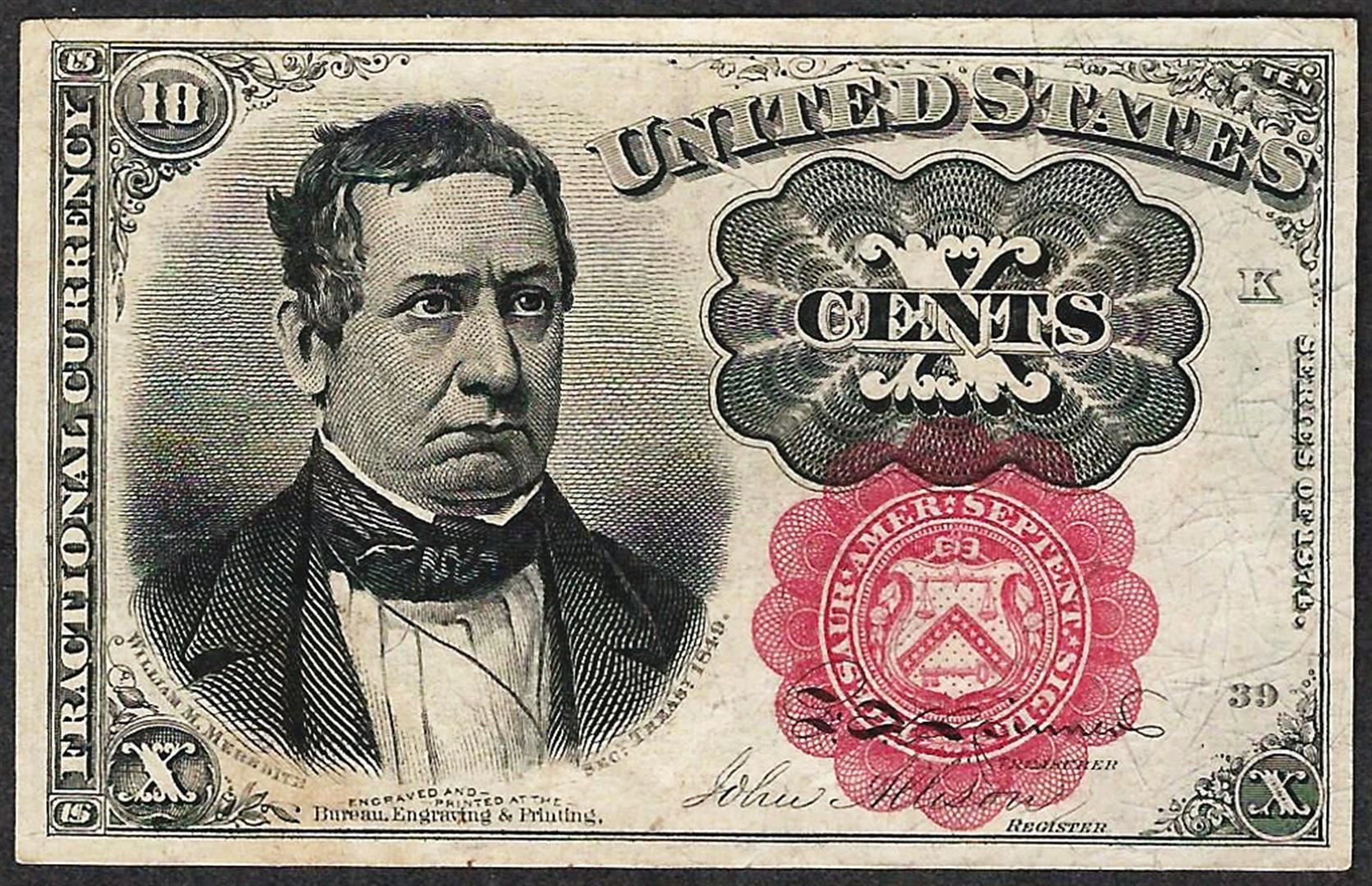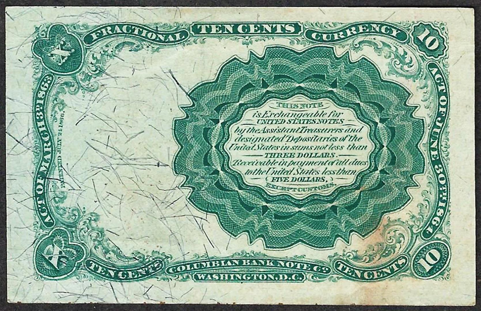 One 1874 Ten Cents Fifth Issue Fractional Currency Note.