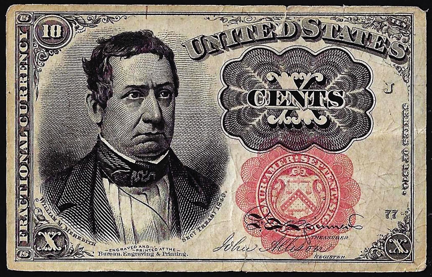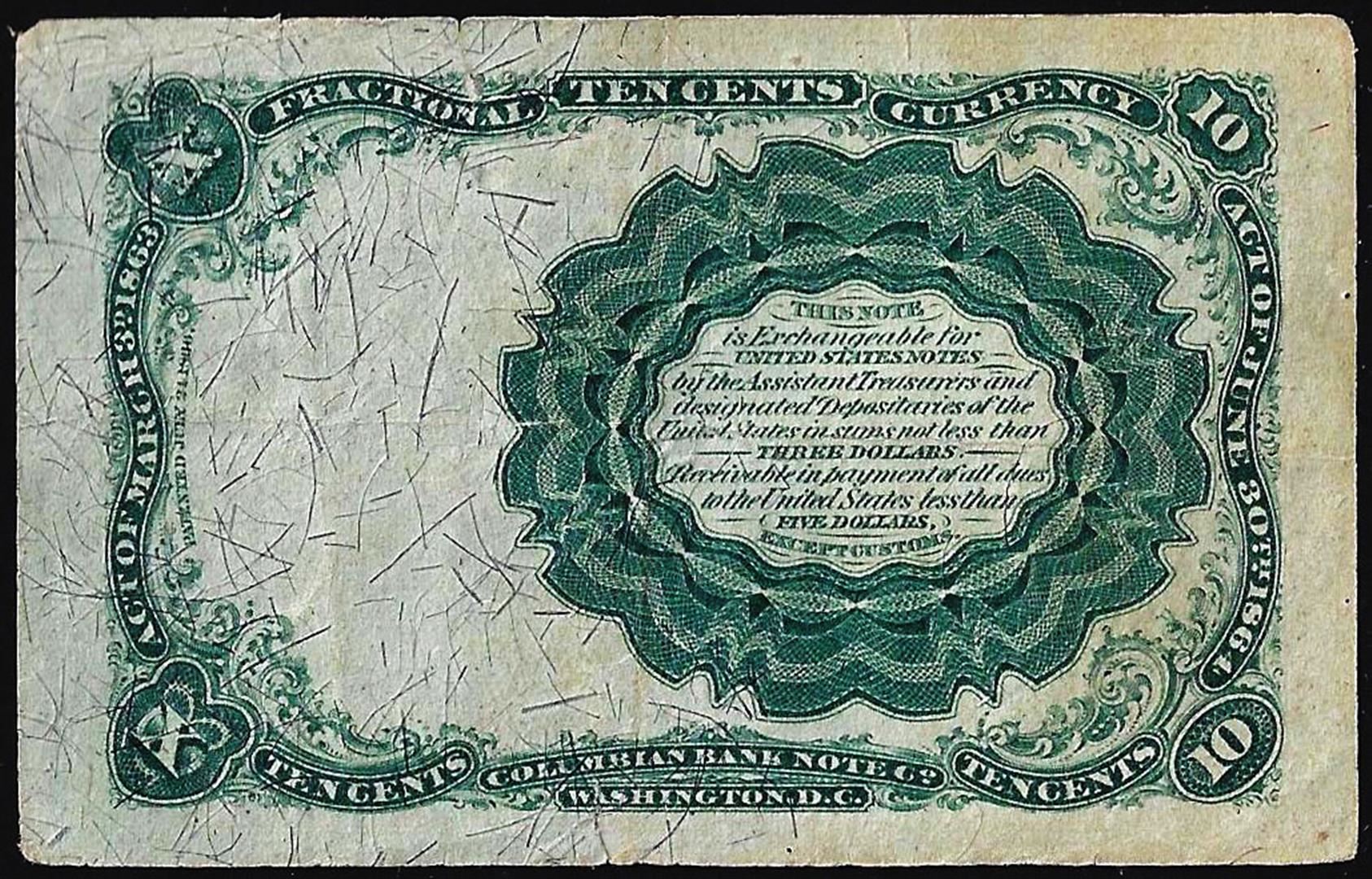 One 1874 Ten Cents Fifth Issue Fractional Currency Note.