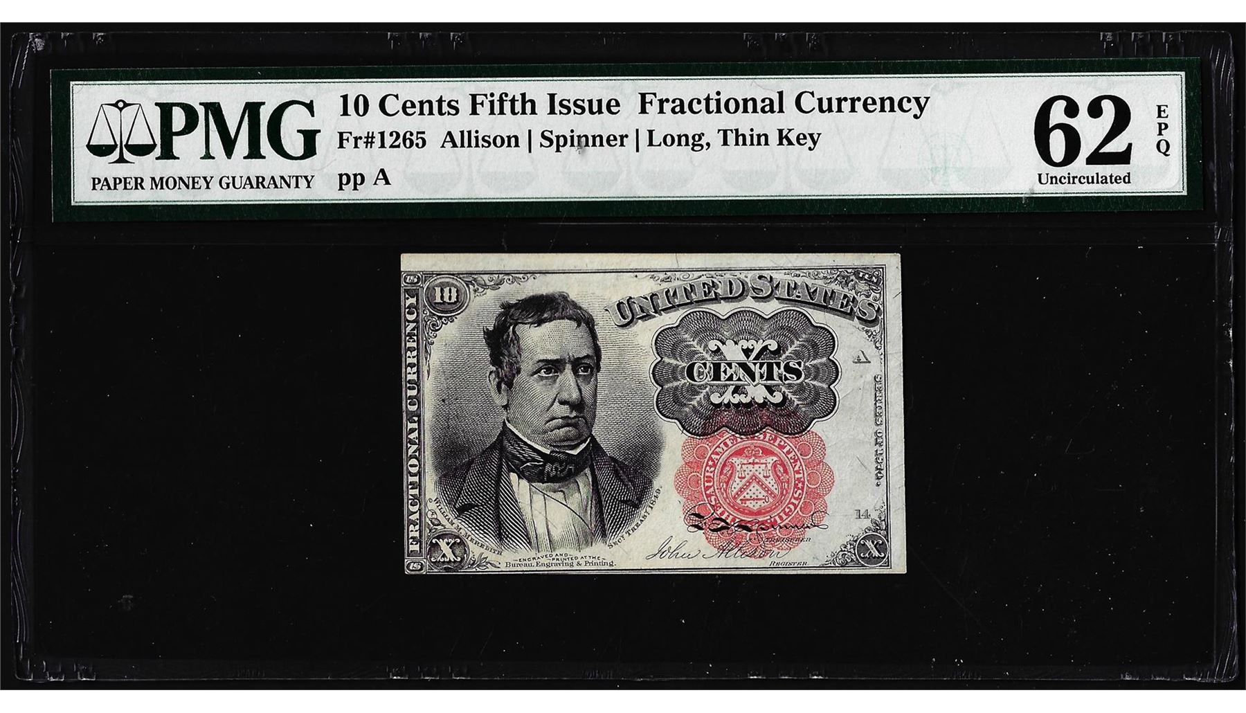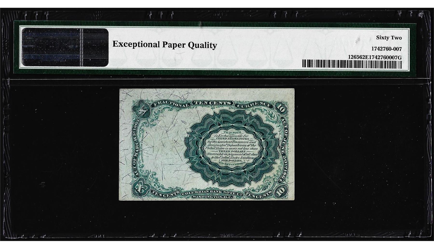 One 1874 Ten Cents Fifth Issue Fractional Note Fr.1265 PMG Uncirculated 62EPQ. PMG Certified.