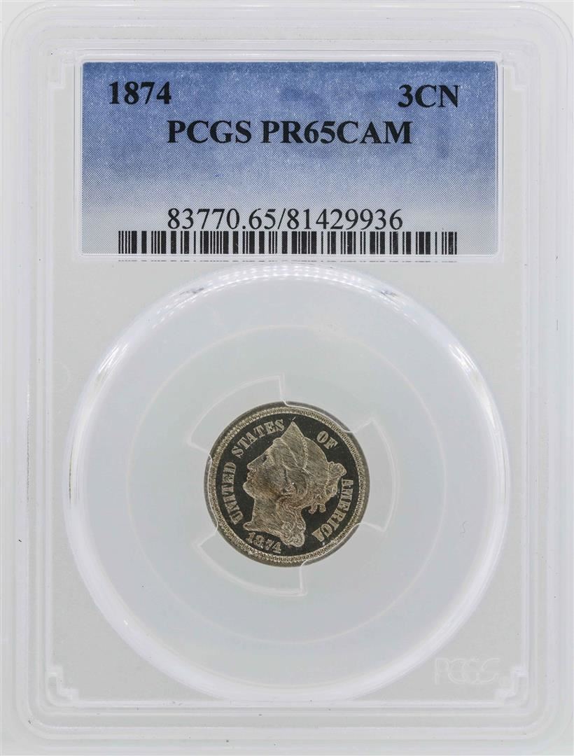 One 1874 Three Cent Nickel Proof Coin PCGS PR65CAM. PCGS Graded.