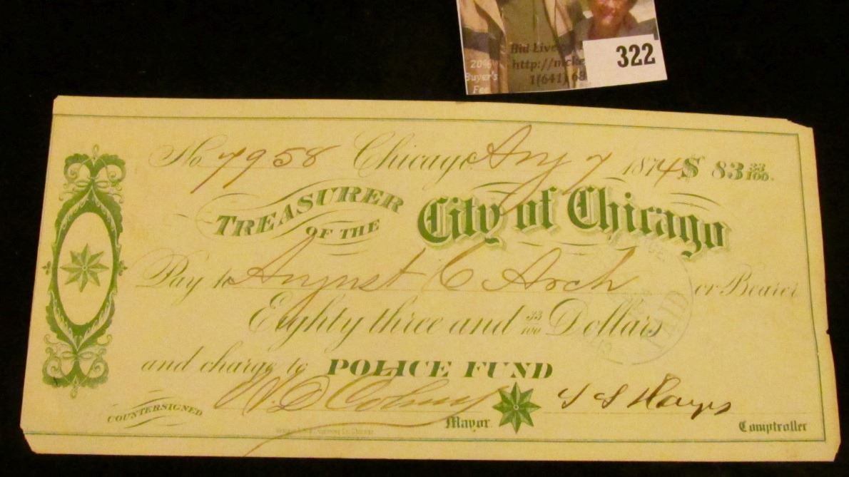 1874 "Treasurer of the City of Chicago" Check signed by the Mayor of Chicago; 1857 Check "Banking and Exchange Office of A.J. Mattson of Prophetstown, Ill." (two embossed banker's stamps); & a rare 1889 Check payable by James S. Duncan to Mandell Brothers, & Co. San Jose, New Mexico Territory, with two paid Stamps from Las Vegas, N.M.