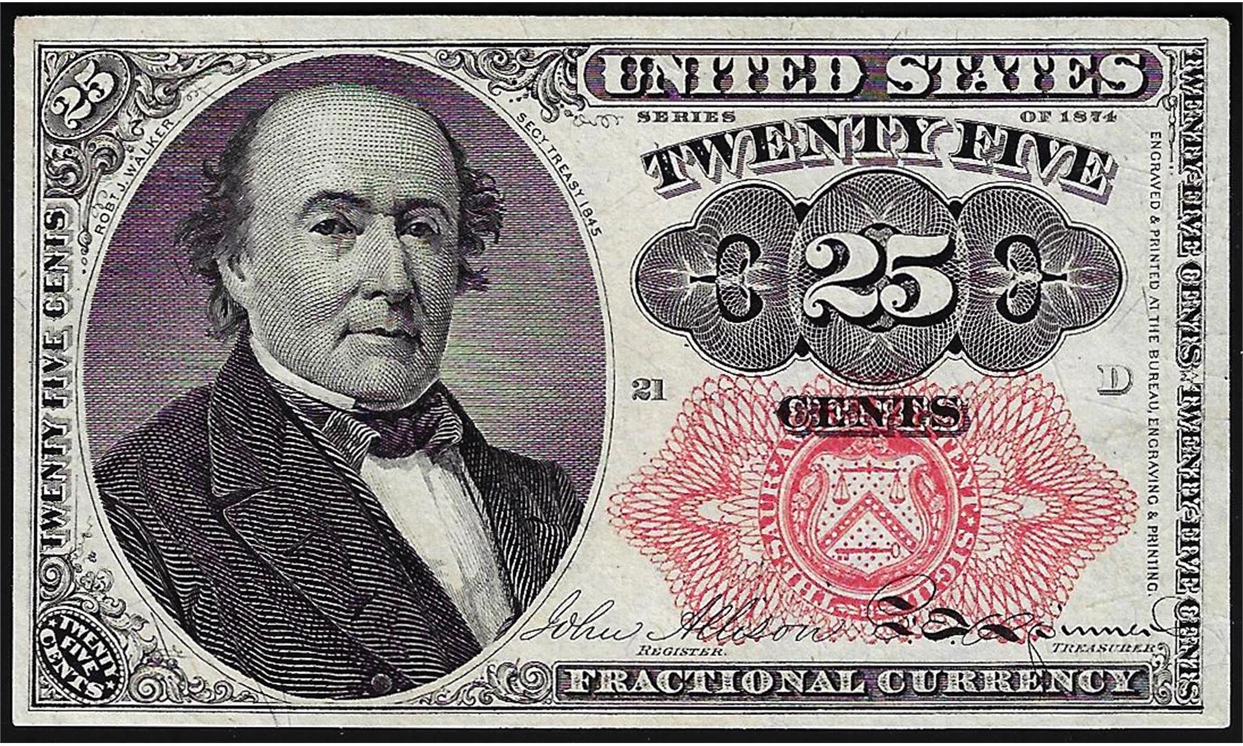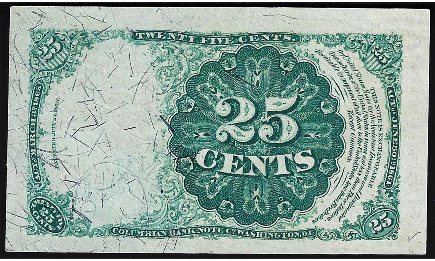 One 1874 Twenty Five Cents Fifth Issue Fractional Currency Note.