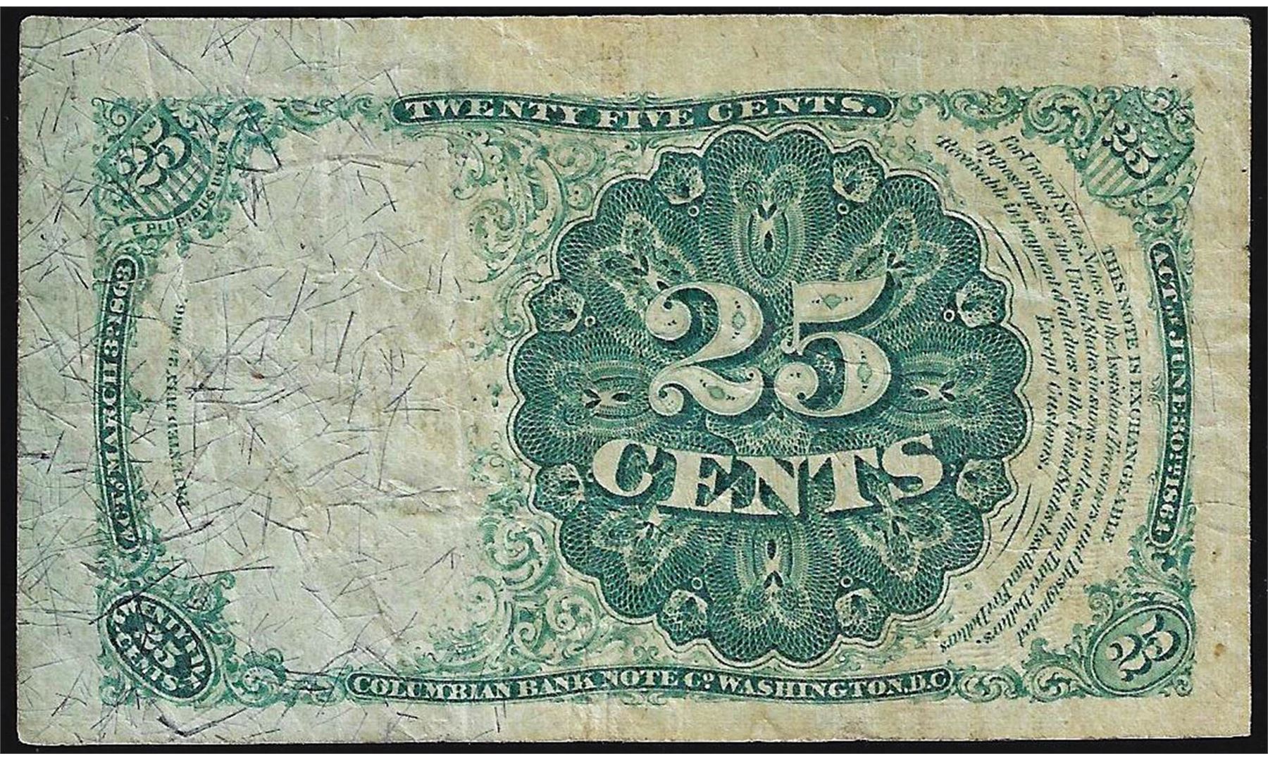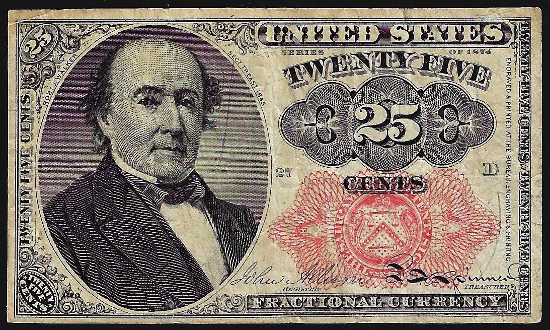 One 1874 Twenty Five Cents Fifth Issue Fractional Currency Note.