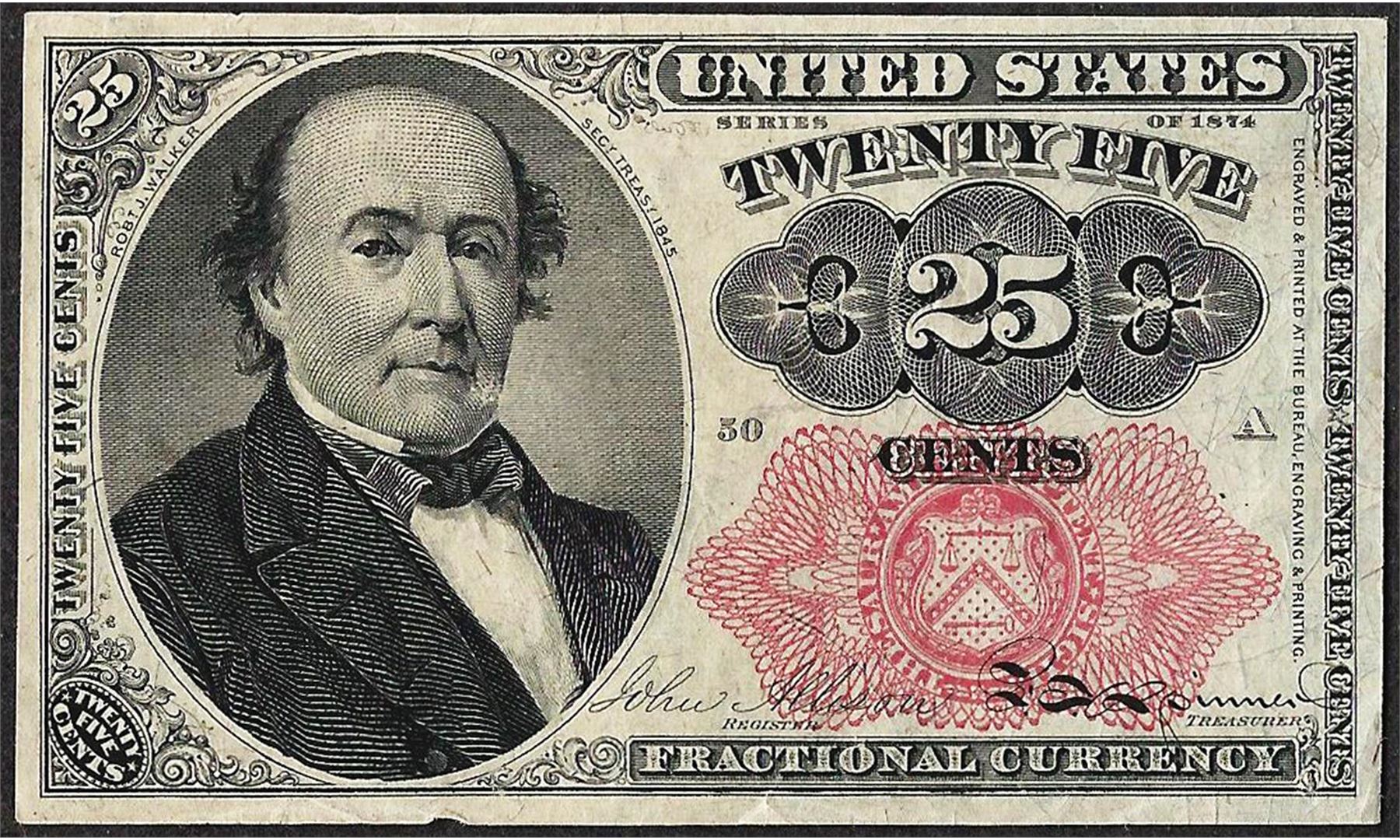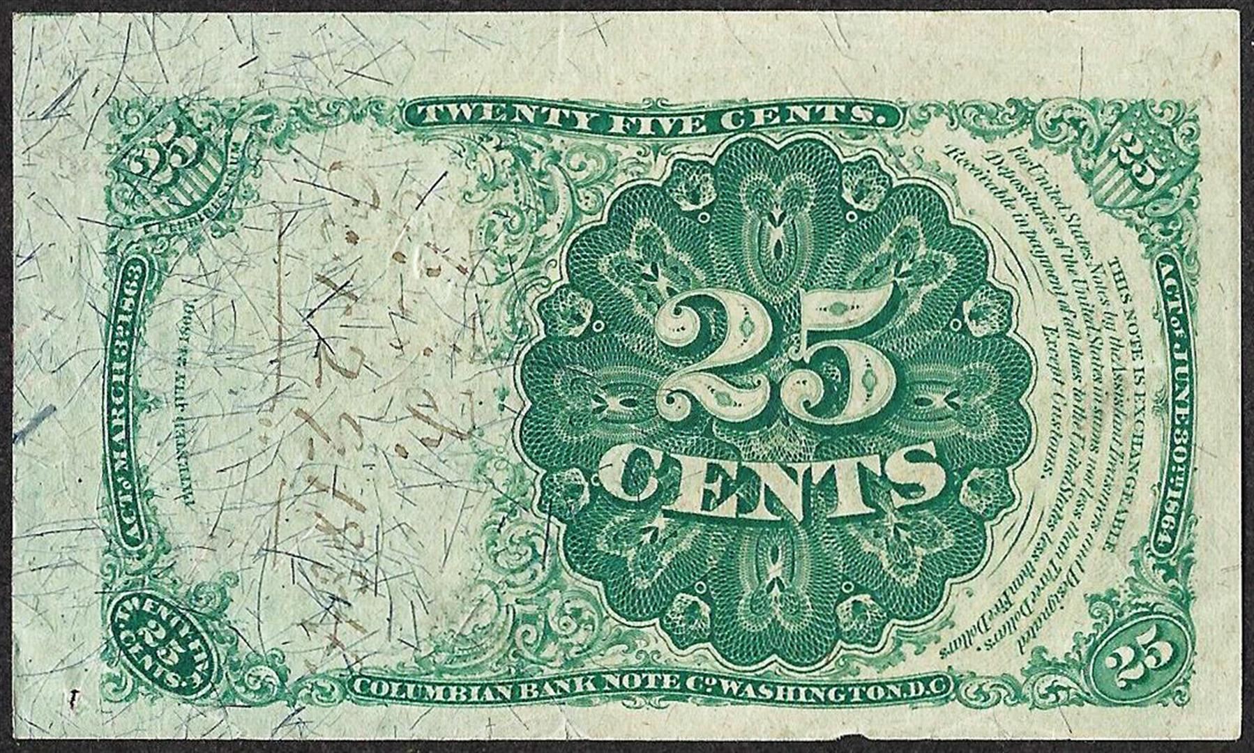 One 1874 Twenty-Five Cents Fifth Issue Fractional Currency Note.
