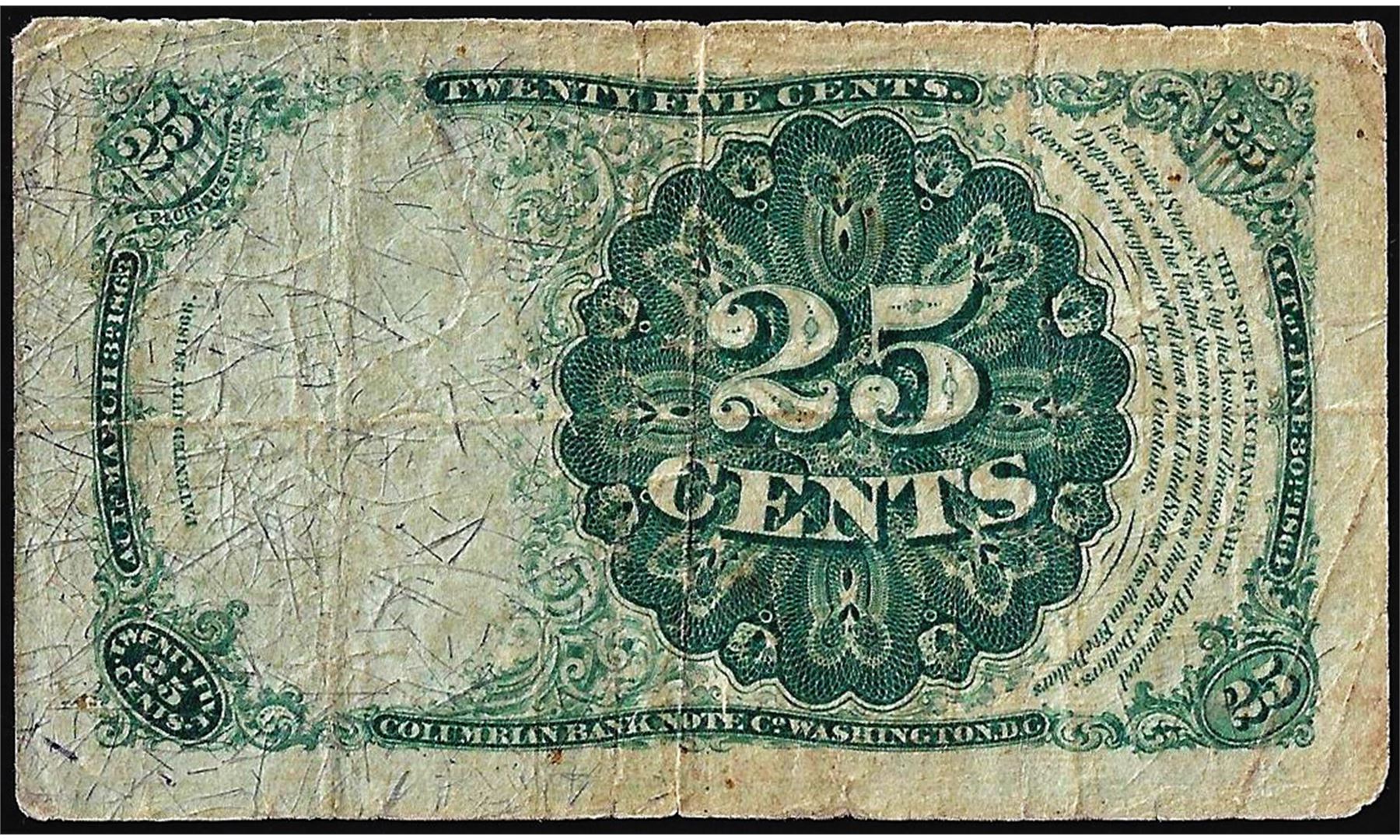One 1874 Twenty Five Cents Fifth Issue Fractional Currency Note.