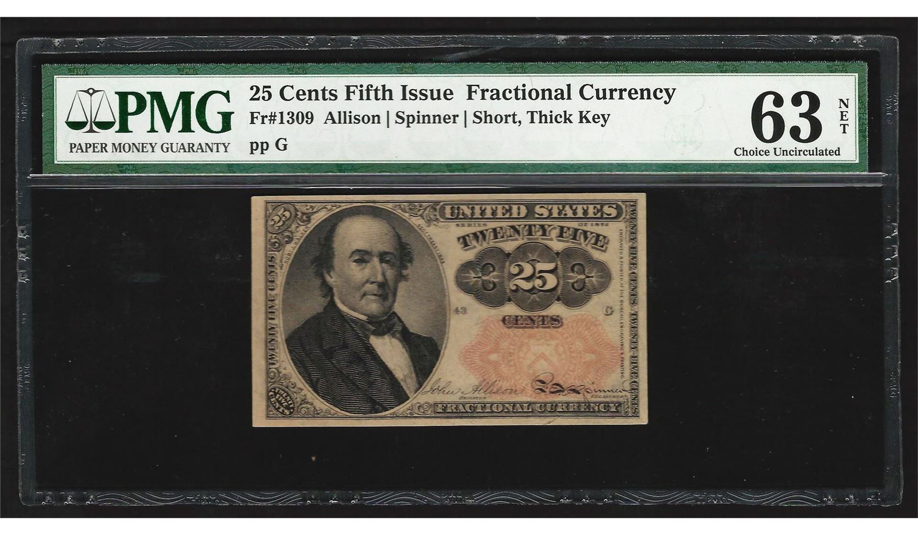 One 1874 Twenty Five Cents Fifth Issue Fractional Note PMG Choice Uncirculated 63 Net. PMG Certified.