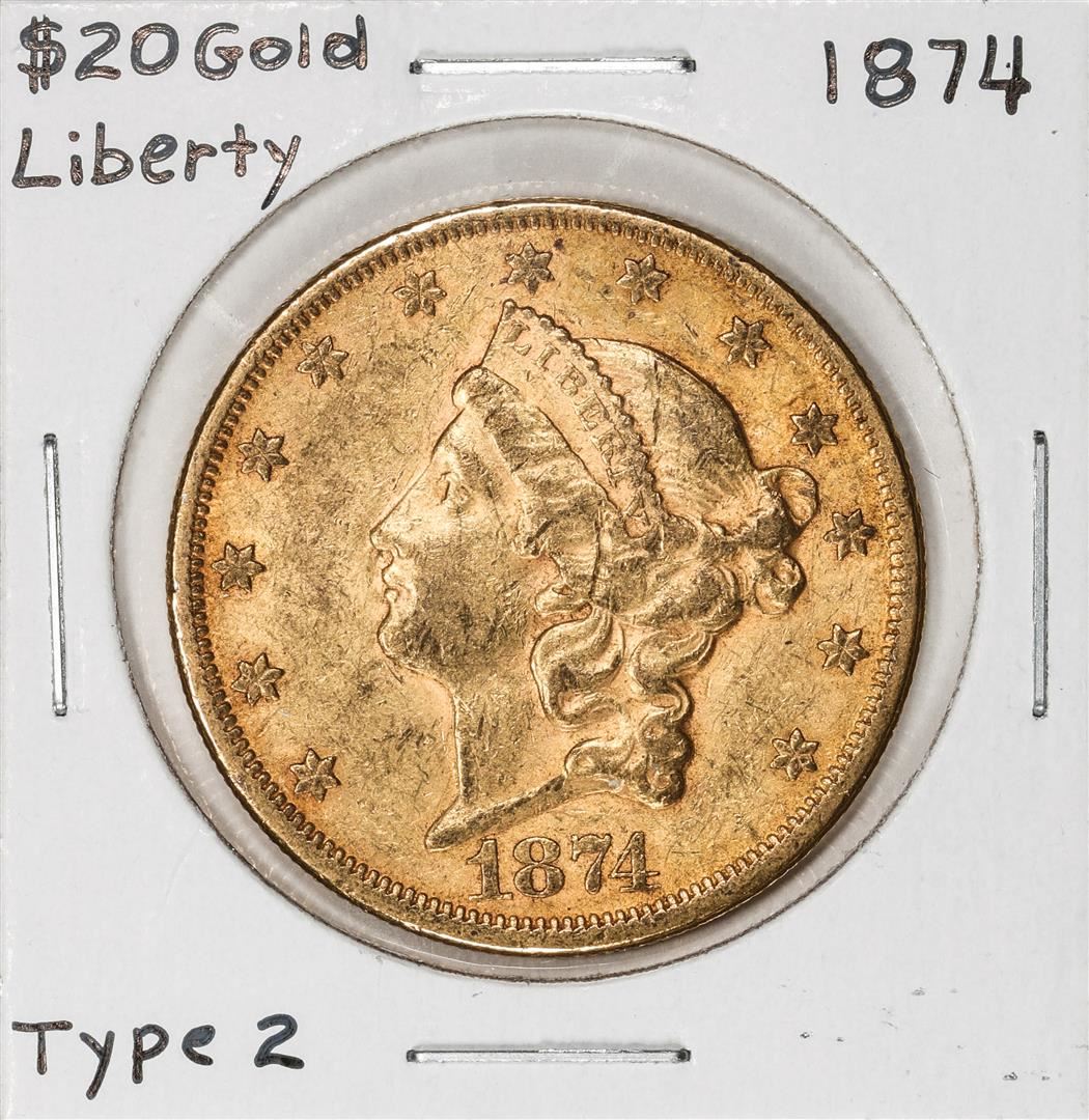 One 1874 Type 2 $20 Liberty Head Double Eagle Gold Coin.