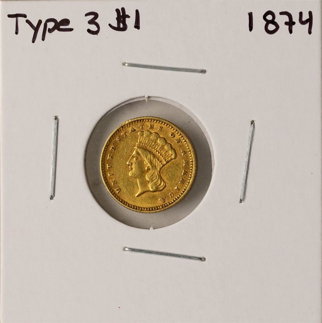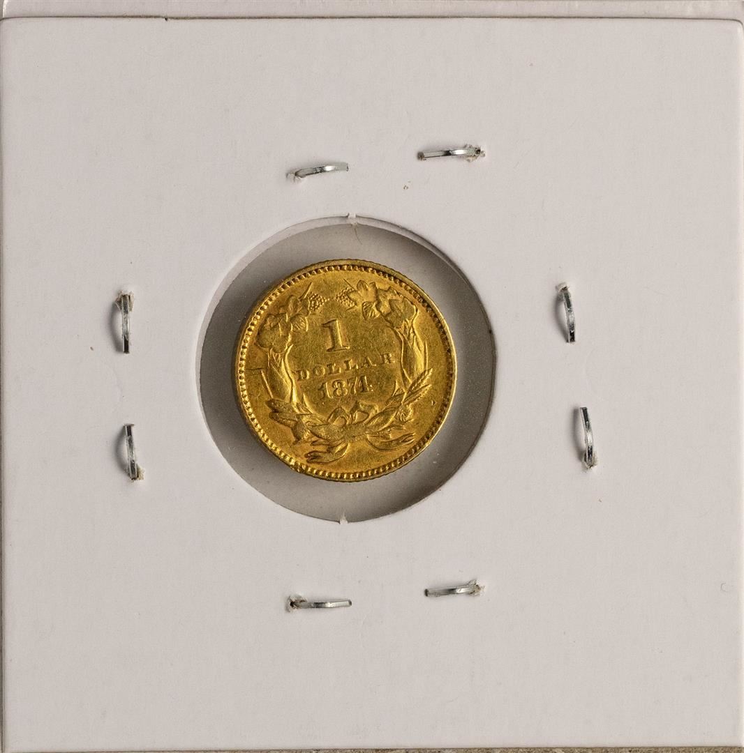 One 1874 Type 3 $1 Indian Princess Head Gold Dollar Coin.