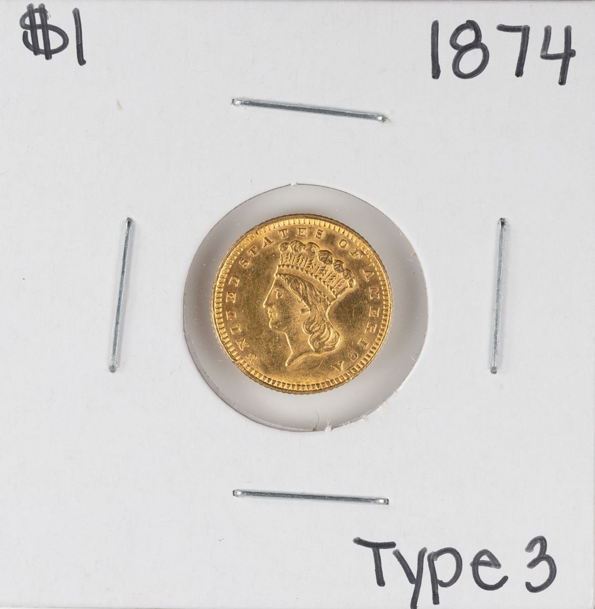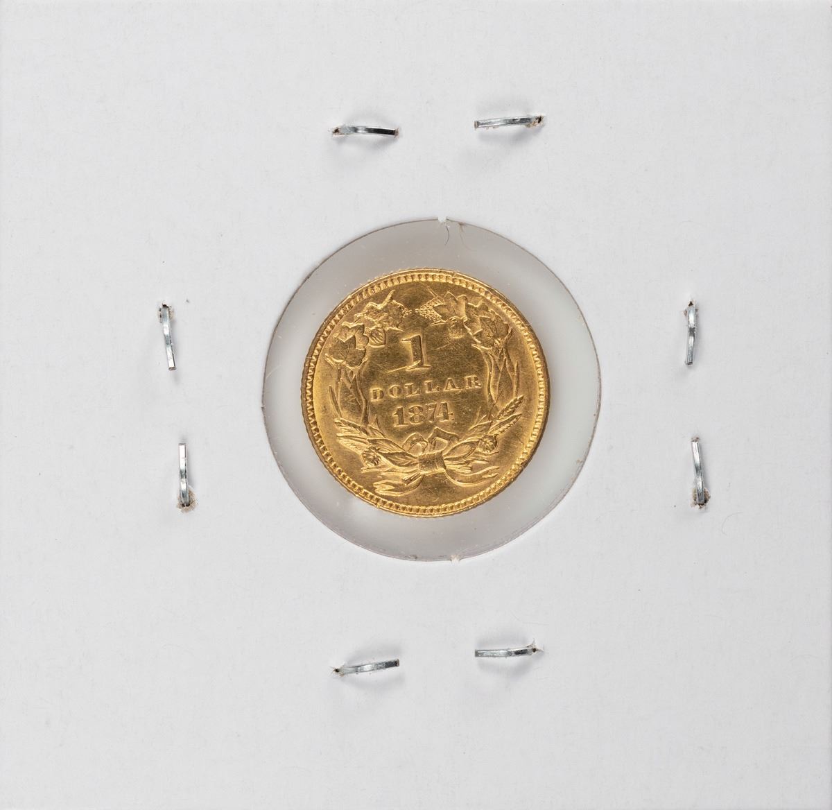 One 1874 Type 3 $1 Indian Princess Head Gold Dollar Coin.