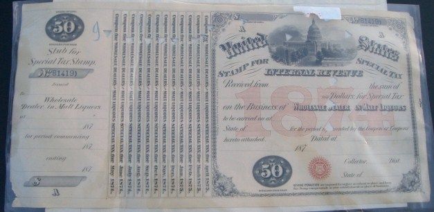 1874 UNITED STATES INTERNAL REVENUE SPECIAL TAX CERTIFICATE *EXTREMELY RARE NO.B1419*!! THIS CERT. WAS ISSUED FOR A *WHOLESALE DEALER IN MALT LIQUORS* & 12 COUPONS ATTACHED FOR MAY-DECEMBER 1874 - JANUARY-APRIL 1875!! ***Coin, Currency & All Items Listed in this auction - Grades, Conditions and Values are not Safe Deposit Coins LLC Responsibilty. Grades, Condition and Values are determined by Consigner(s) & Buyers ONLY***