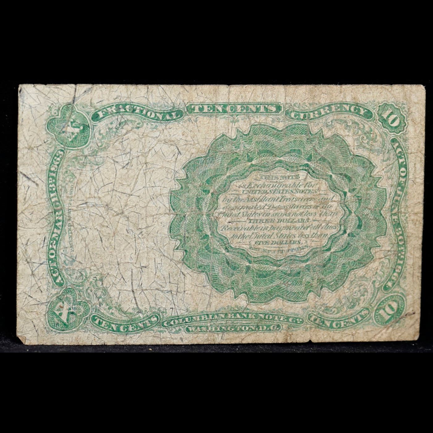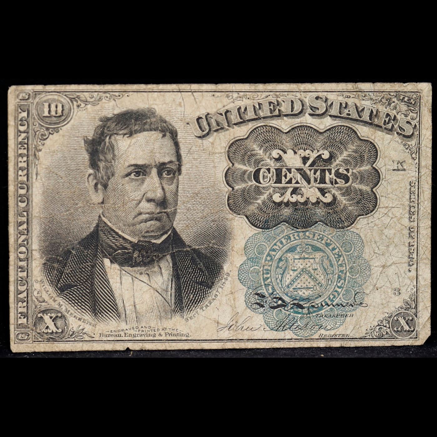 1874 US Fractional Currency Ten Cent Note 5th Issue, Fr-1264 Long,Thin Key Grades f+. Fractional or postage currency has a rich history. At the beginning of the Civil War people starting hoarding coins for their precious metal content. Coins became difficult to find because of the hoarding. People started to try to use stamps instead of coins as a means of commerce. The government decided to help ease the hoarding issue by issuing “paper coins” also known as postage currency or fractional currency. Fractional currency was first issued on August 21, 1862 and they were last issued on February 15, 1876. Three cents, five cents, ten cents, twenty-five cents, and fifty cents notes were all issued. Fractional currency is physically smaller than other United States money. It also does not have a serial number.