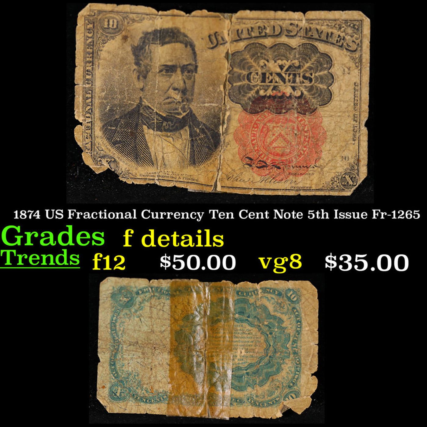 1874 US Fractional Currency Ten Cent Note 5th Issue Fr-1265 Grades f details. Fractional or postage currency has a rich history. At the beginning of the Civil War people starting hoarding coins for their precious metal content. Coins became difficult to find because of the hoarding. People started to try to use stamps instead of coins as a means of commerce. The government decided to help ease the hoarding issue by issuing “paper coins” also known as postage currency or fractional currency. Fractional currency was first issued on August 21, 1862 and they were last issued on February 15, 1876. Three cents, five cents, ten cents, twenty-five cents, and fifty cents notes were all issued. Fractional currency is physically smaller than other United States money. It also does not have a serial number.