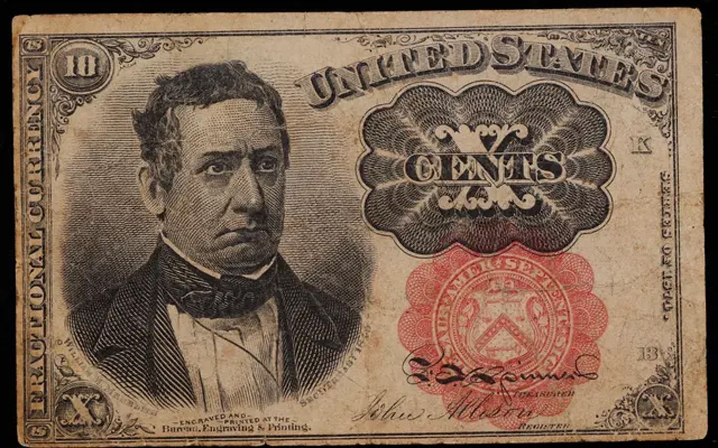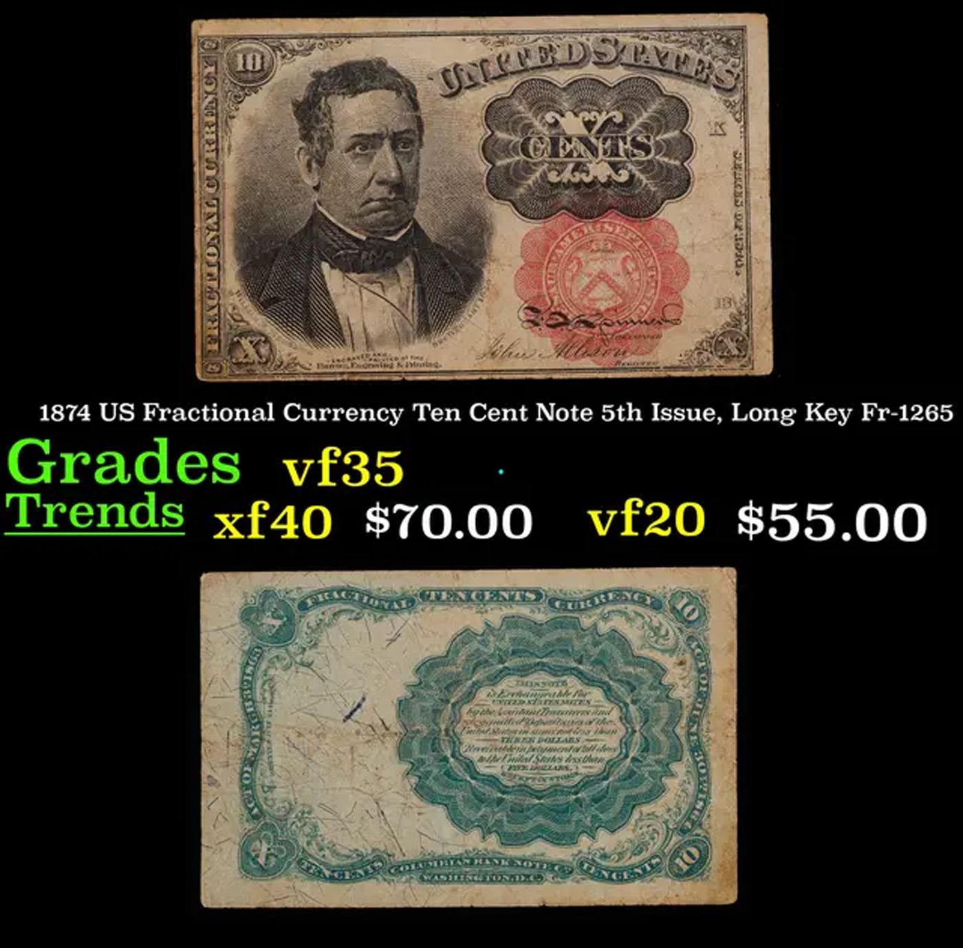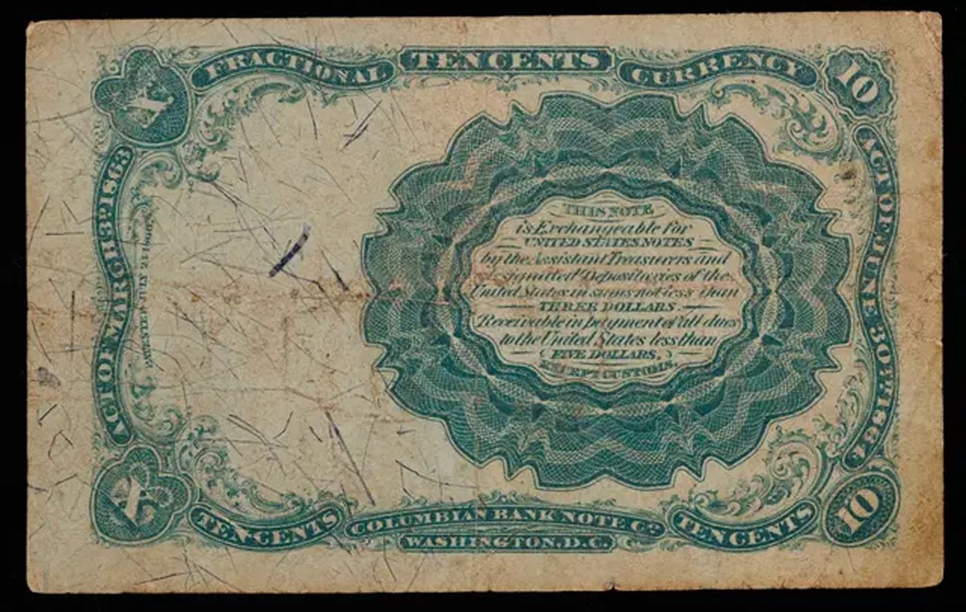 1874 US Fractional Currency Ten Cent Note 5th Issue, Long Key Fr-1265 Grades vf++. Fractional or postage currency has a rich history. At the beginning of the Civil War people starting hoarding coins for their precious metal content. Coins became difficult to find because of the hoarding. People started to try to use stamps instead of coins as a means of commerce. The government decided to help ease the hoarding issue by issuing “paper coins” also known as postage currency or fractional currency. Fractional currency was first issued on August 21, 1862 and they were last issued on February 15, 1876. Three cents, five cents, ten cents, twenty-five cents, and fifty cents notes were all issued. Fractional currency is physically smaller than other United States money. It also does not have a serial number.