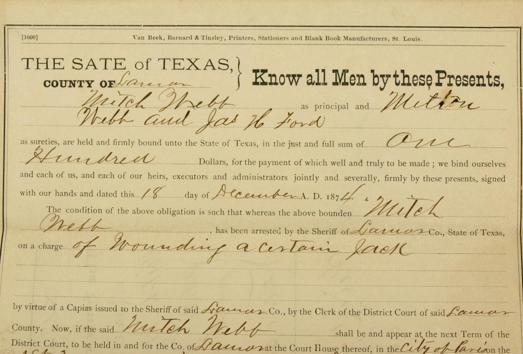 city of Paris, for shooting and wounding a horse named Jack. Bond set at $100 for Mitch Webb. Early piece of Texas history in very good condition.