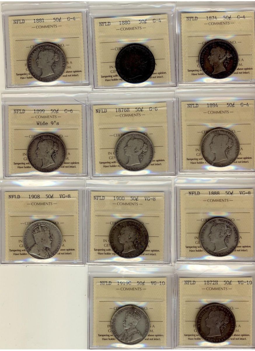 1874 to 1919c Nfld 50¢. Lot of 11 coins all ICCS graded. Includes 1874, 1880, 1881 & 1894 G4 and 1876H & 1899 Wd 9 G6 and 1888, 1900 & 1908 VG8 and 1872H & 1919c VG10.