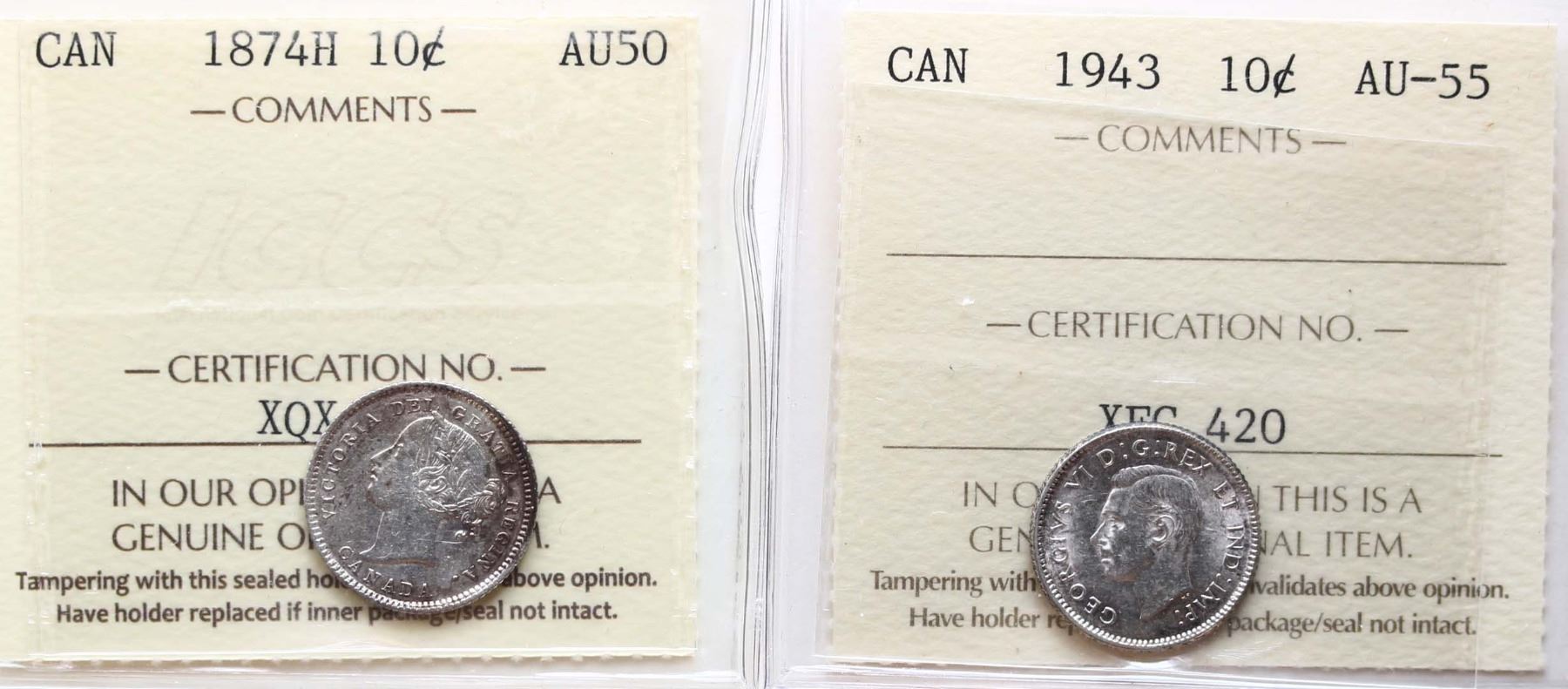 1874H 10¢ ICCS About Uncirculated-50, 1943 ICCS Choice About Uncirculated-55