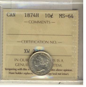 1874H 10¢ ICCS MS64. Crisp and sharp white issue.