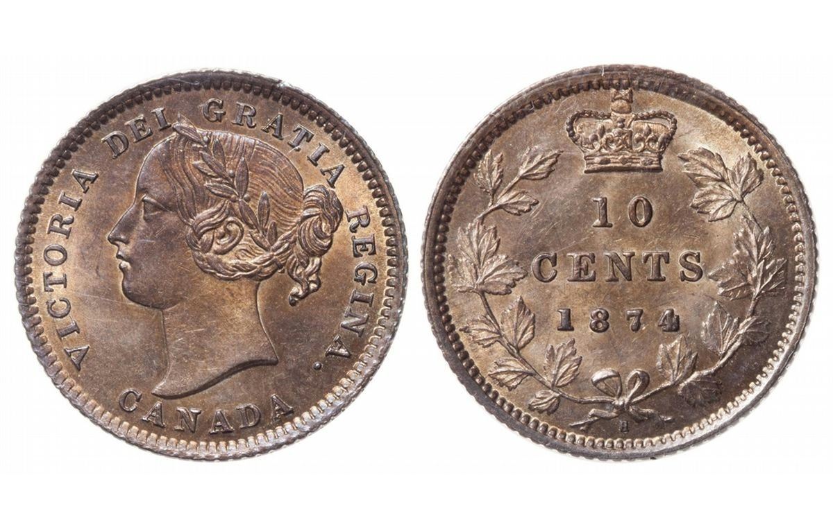 1874H 10¢ ICCS MS65; Rare with gold toning and full original lustre. Superb Gem example.