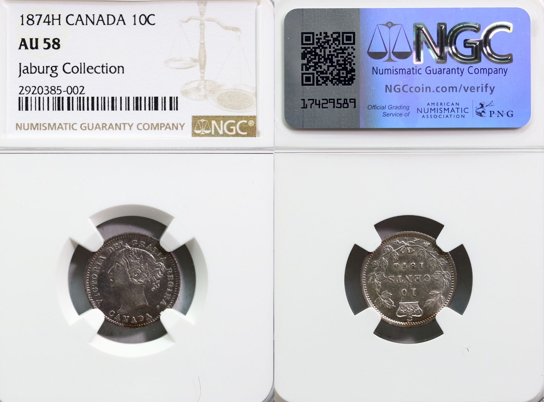 1874H 10¢ NGC Choice About Uncirculated-58 Lustrous. Jaburg Collection.