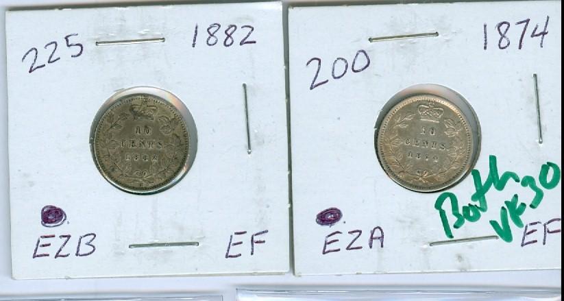 1874H & 1882H 10¢. Lot of 2 coins both VF30.