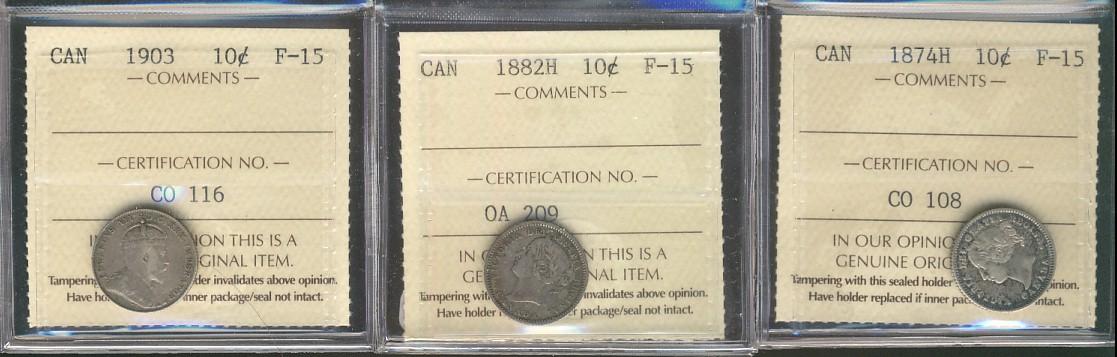 1874H, 1882H & 1903 10¢ ICCS F15. Lot of 3 coins.