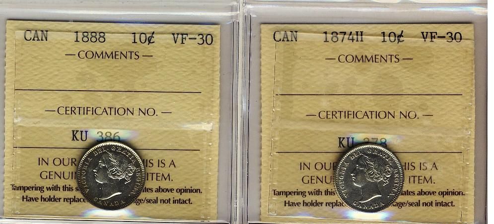 1874H & 1888 10¢ ICCS VF30. Lot of 2 coins.