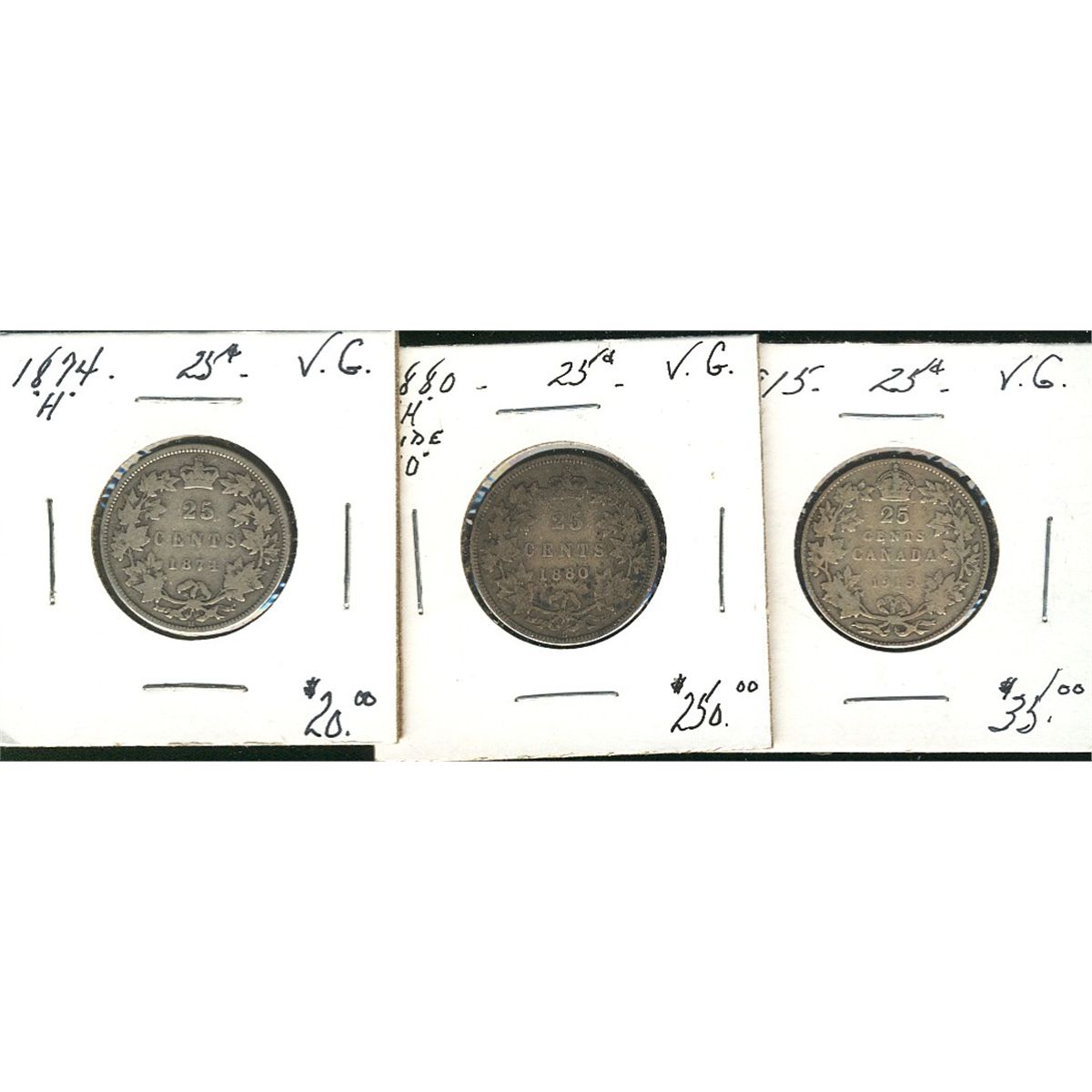 1874H 25¢, 1880H Wd & 1915 VG. Lot of 3 coins. (PBA).