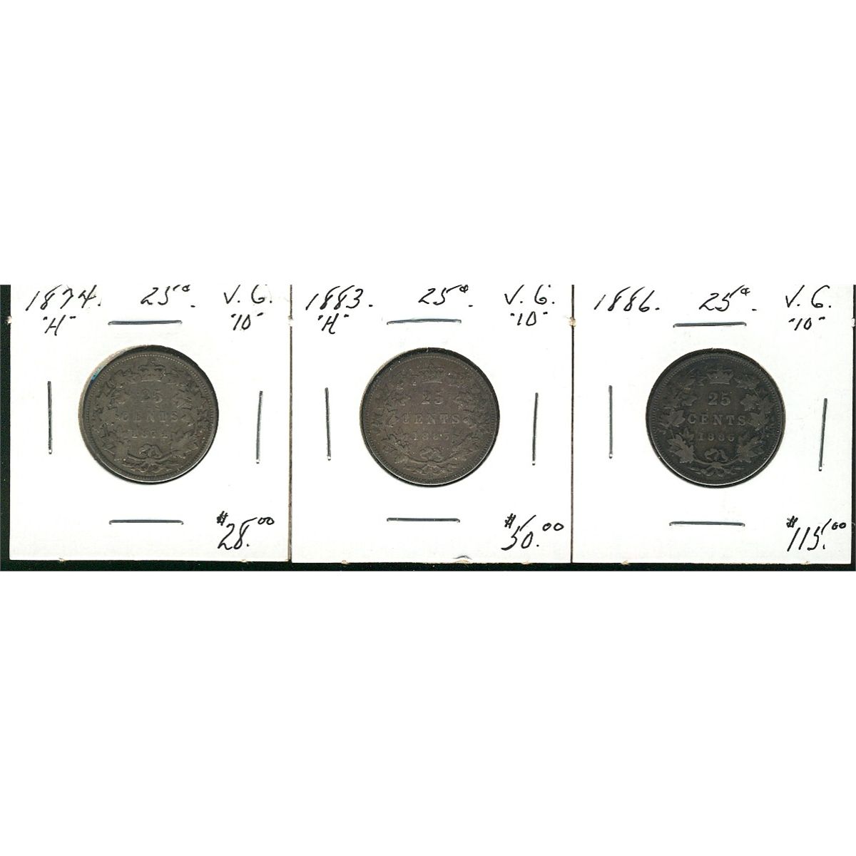1874H 25¢, 1883H & 1886 VG+. Lot of 3 coins. (PBA).